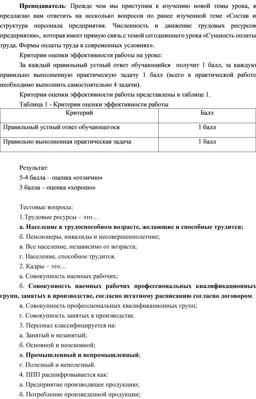 Преподаватель: Прежде чем мы приступим к изучению новой темы урока, я предлагаю вам ответить на несколько вопросов по ранее изученной теме «Состав и структура персонала предприятия. Численность и движение трудовых ресурсов предприятия», которая имеет прямую связь с темой сегодняшнего урока «Сущность оплаты труда. Формы оплаты труда в современных условиях».