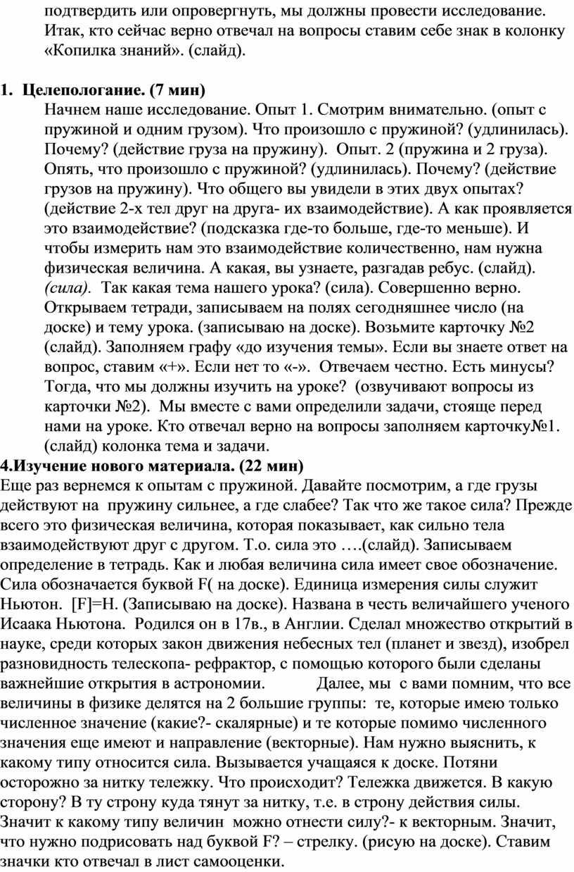 Начнем наше исследование. Опыт 1. Смотрим внимательно. (опыт с пружиной и одним грузом). Что произошло с пружиной? (удлинилась). Почему? (действие груза на пружину). Опыт. 2 (пружина и 2 груза). Опять, что произошло с пружиной? (удлинилась). Почему? (действие грузов на пружину). Что общего вы увидели в этих двух опытах? (действие 2-х тел друг на друга- их взаимодействие). А как проявляется это взаимодействие? (подсказка где-то больше, где-то меньше). И чтобы измерить нам это взаимодействие количественно, нам нужна физическая величина. А какая, вы узнаете, разгадав ребус. (слайд). (сила). Так какая тема нашего урока? (сила). Совершенно верно. Открываем тетради, записываем на полях сегодняшнее число (на доске) и тему урока. (записываю на доске). Возьмите карточку №2 (слайд). Заполняем графу «до изучения темы». Если вы знаете ответ на вопрос, ставим «+». Если нет то «-». Отвечаем честно. Есть минусы? Тогда, что мы должны изучить на уроке? (озвучивают вопросы из карточки №2). Мы вместе с вами определили задачи, стояще перед нами на уроке. Кто отвечал верно на вопросы заполняем карточку№1. (слайд) колонка тема и задачи.
