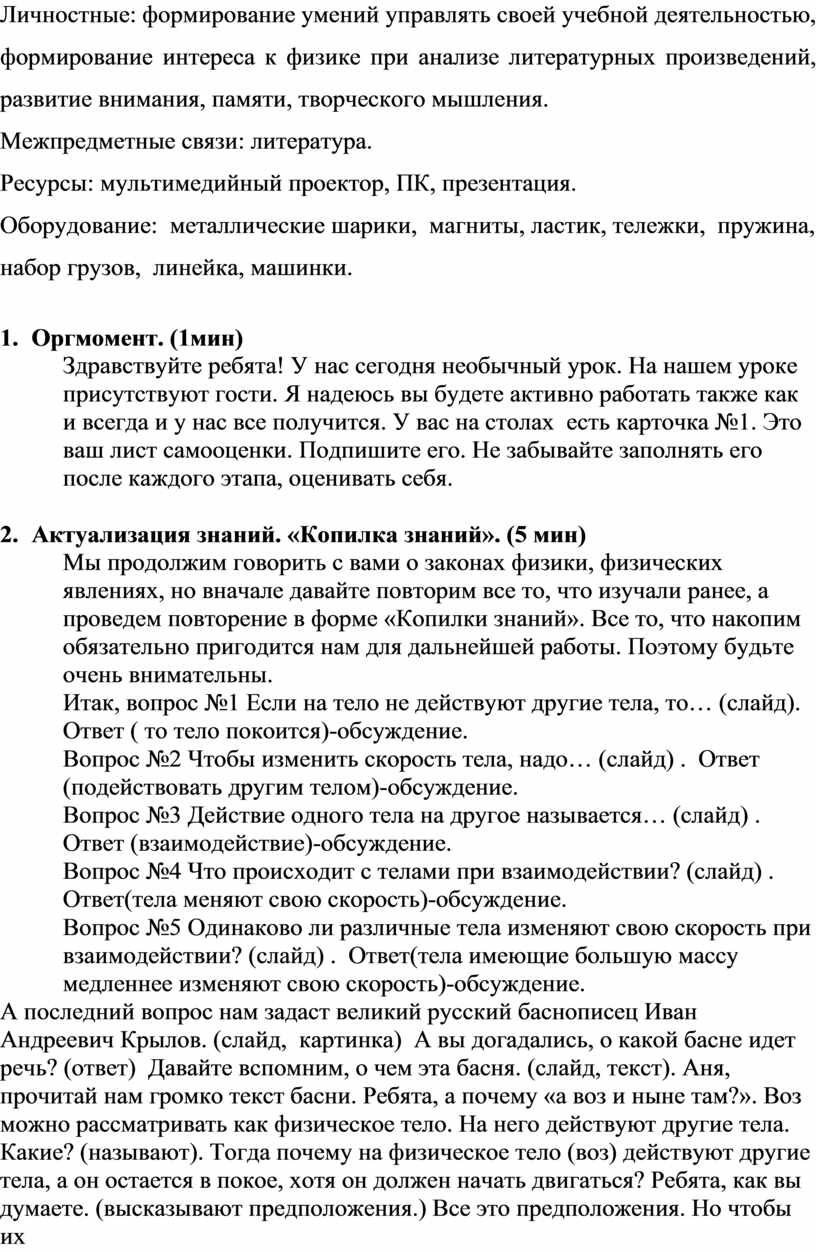 А теперь вернемся к вопросу в басне Крылова «а воз и ныне там». Почему на рисунке появилось изображение стрелок? (стрелки показывают действие тел (сила) на воз). А что вы можете сказать о длине этих стрелок? (они одинаковы). О чем это говорит? (силы одинаковы). А направление? (везде разное). Так почему же воз остался на месте? (из-за того, что силы одинаковы и направлены в разные стороны). Молодцы, ваше предположение верно. А в дальнейшем эта физическая ситуация будет изучена нами более подробно. Теперь возьмем карточки №2 и заполним столбец после изучения темы. И заполняем лист самооценки, кто верно отвечал на вопросы по басне. Мы с вами хорошо поработали. А теперь оцените себя. Критерии на слайде.