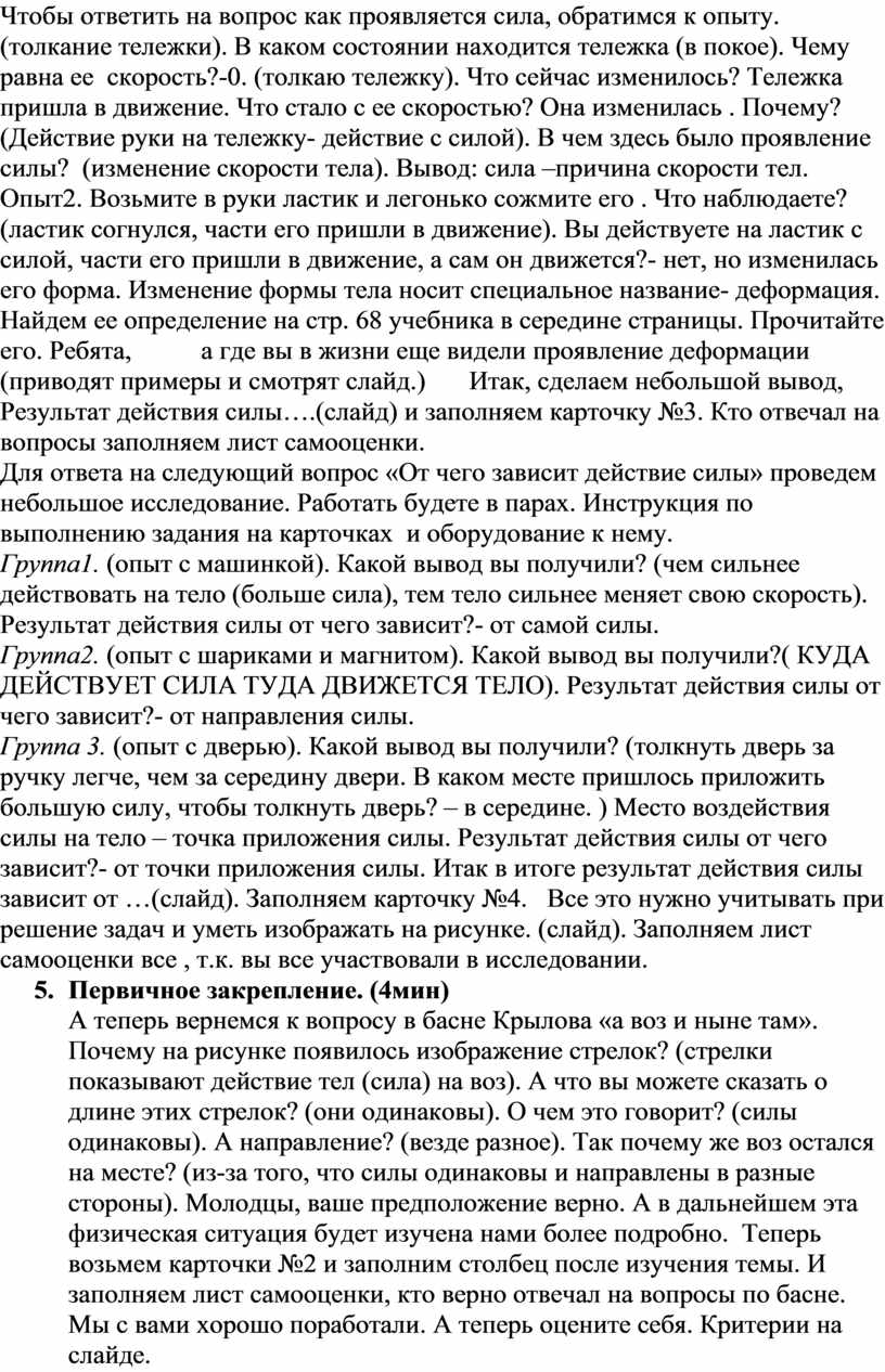 Чтобы ответить на вопрос как проявляется сила, обратимся к опыту. (толкание тележки). В каком состоянии находится тележка (в покое). Чему равна ее скорость?-0. (толкаю тележку). Что сейчас изменилось? Тележка пришла в движение. Что стало с ее скоростью? Она изменилась . Почему? (Действие руки на тележку- действие с силой). В чем здесь было проявление силы? (изменение скорости тела). Вывод: сила –причина скорости тел. Опыт2. Возьмите в руки ластик и легонько сожмите его . Что наблюдаете? (ластик согнулся, части его пришли в движение). Вы действуете на ластик с силой, части его пришли в движение, а сам он движется?- нет, но изменилась его форма. Изменение формы тела носит специальное название- деформация. Найдем ее определение на стр. 68 учебника в середине страницы. Прочитайте его. Ребята, а где вы в жизни еще видели проявление деформации (приводят примеры и смотрят слайд.) Итак, сделаем небольшой вывод, Результат действия силы….(слайд) и заполняем карточку №3. Кто отвечал на вопросы заполняем лист самооценки.