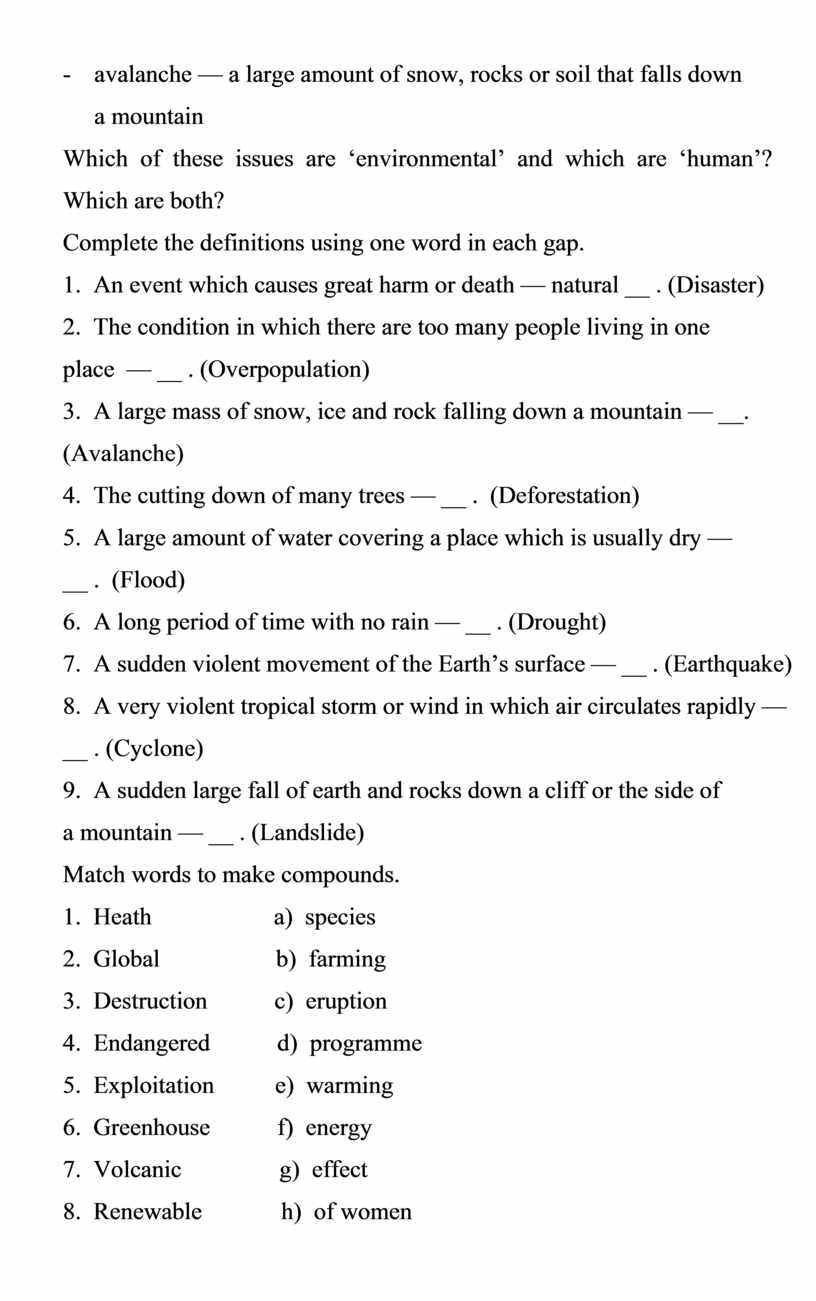 1. An event which causes great harm or death — natural __ . (Disaster)