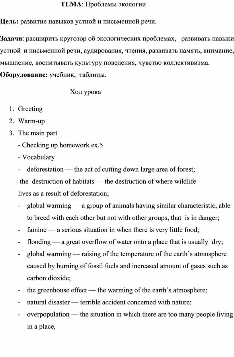 Задачи: расширить кругозор об экологических проблемах, развивать навыки устной и письменной речи, аудирования, чтения, развивать память, внимание, мышление, воспитывать культуру поведения, чувство коллективизма.