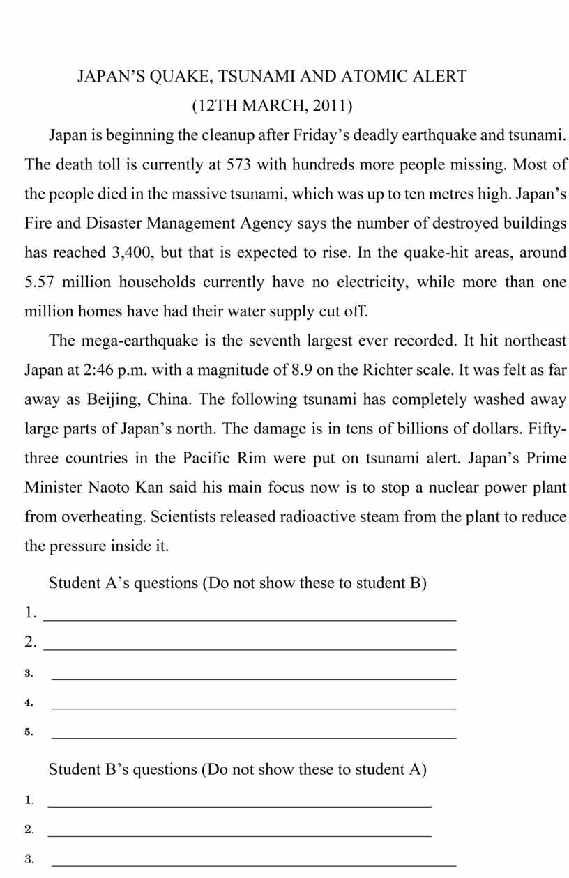 Listen to the information about the disaster in Japan and make up questions for your partner.