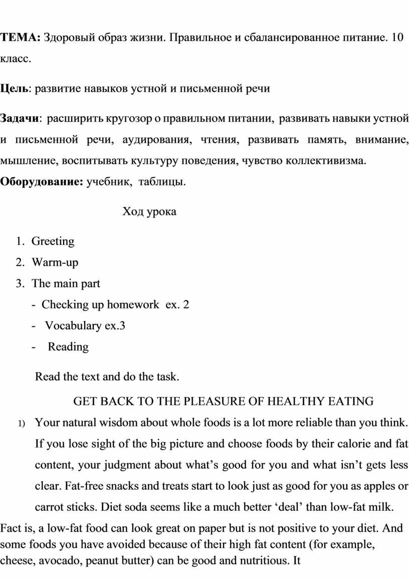 ТЕМА: Здоровый образ жизни. Правильное и сбалансированное питание. 10 класс.