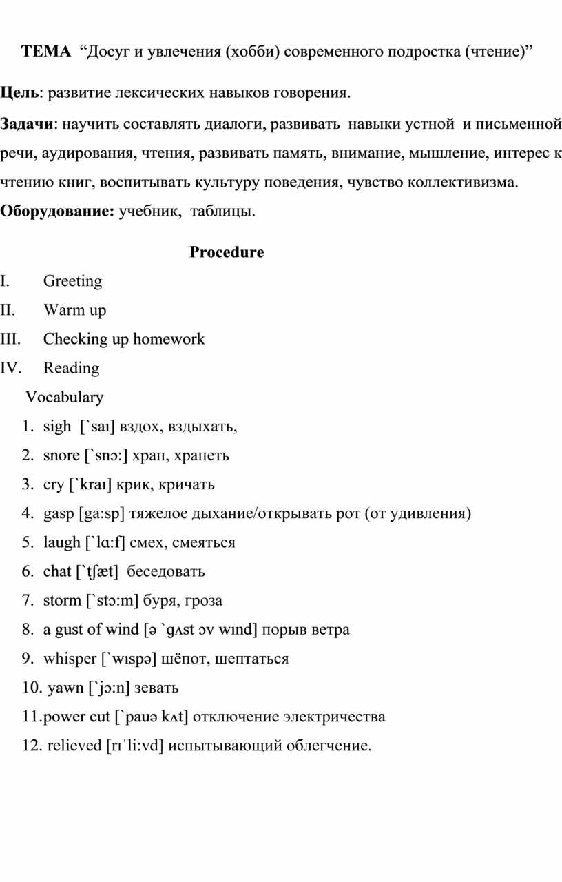 ТЕМА “Досуг и увлечения (хобби) современного подростка (чтение)”