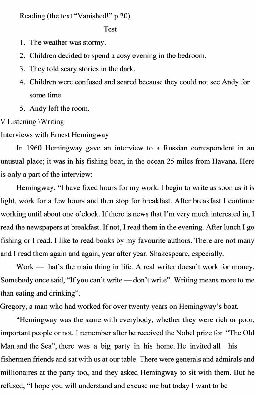 In 1960 Hemingway gave an interview to a Russian correspondent in an unusual place; it was in his fishing boat, in the ocean 25 miles from Havana. Here is only a part of the interview: