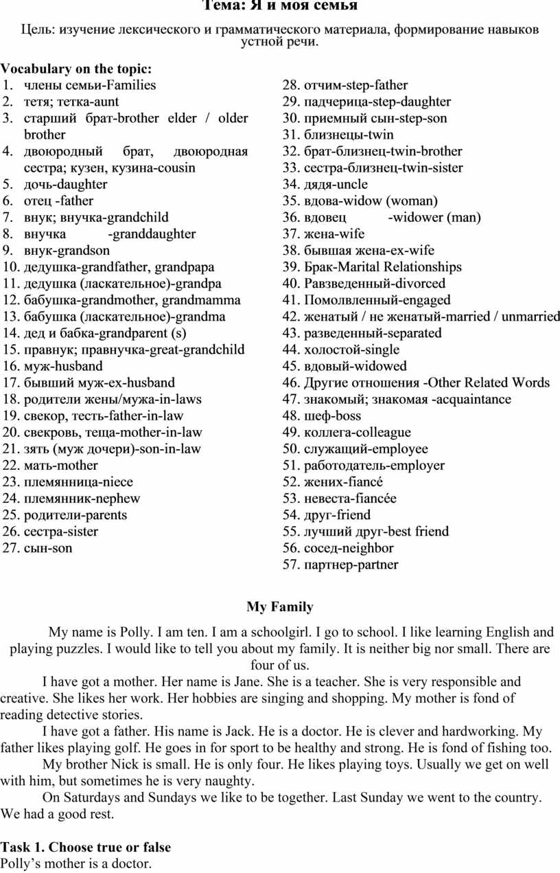 1. члены семьи-Families 2. тетя; тетка-aunt 3. старший брат-brother elder / older brother 4. двоюродный брат, двоюродная сестра; кузен, кузина-cousin 5. дочь-daughter 6. отец -father 7. внук; внучка-grandchild 8. внучка -granddaughter 9. внук-grandson 10. дедушка-grandfather, grandpapa 11. дедушка (ласкательное)-grandpa 12. бабушка-grandmother, grandmamma 13. бабушка (ласкательное)-grandma 14. дед и бабка-grandparent (s) 15. правнук; правнучка-great-grandchild 16. муж-husband 17. бывший муж-ex-husband 18. родители жены/мужа-in-laws 19. свекор, тесть-father-in-law 20. свекровь, теща-mother-in-law 21. зять (муж дочери)-son-in-law 22. мать-mother 23. племянница-niece 24. племянник-nephew 25. родители-parents 26. сестра-sister 27. сын-son