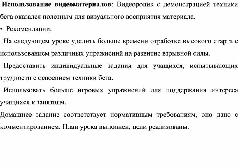 Использование видеоматериалов: Видеоролик с демонстрацией техники бега оказался полезным для визуального восприятия материала.