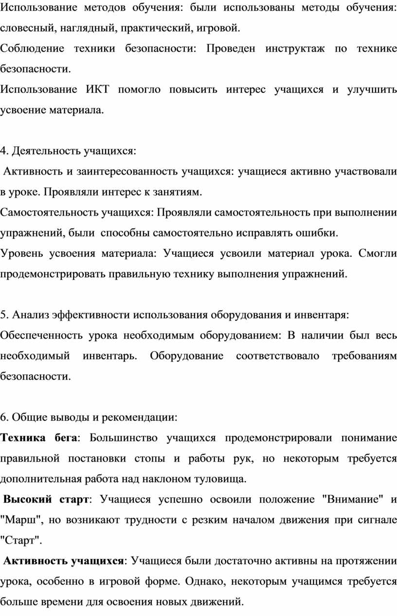 Активность учащихся: Учащиеся были достаточно активны на протяжении урока, особенно в игровой форме. Однако, некоторым учащимся требуется больше времени для освоения новых движений.