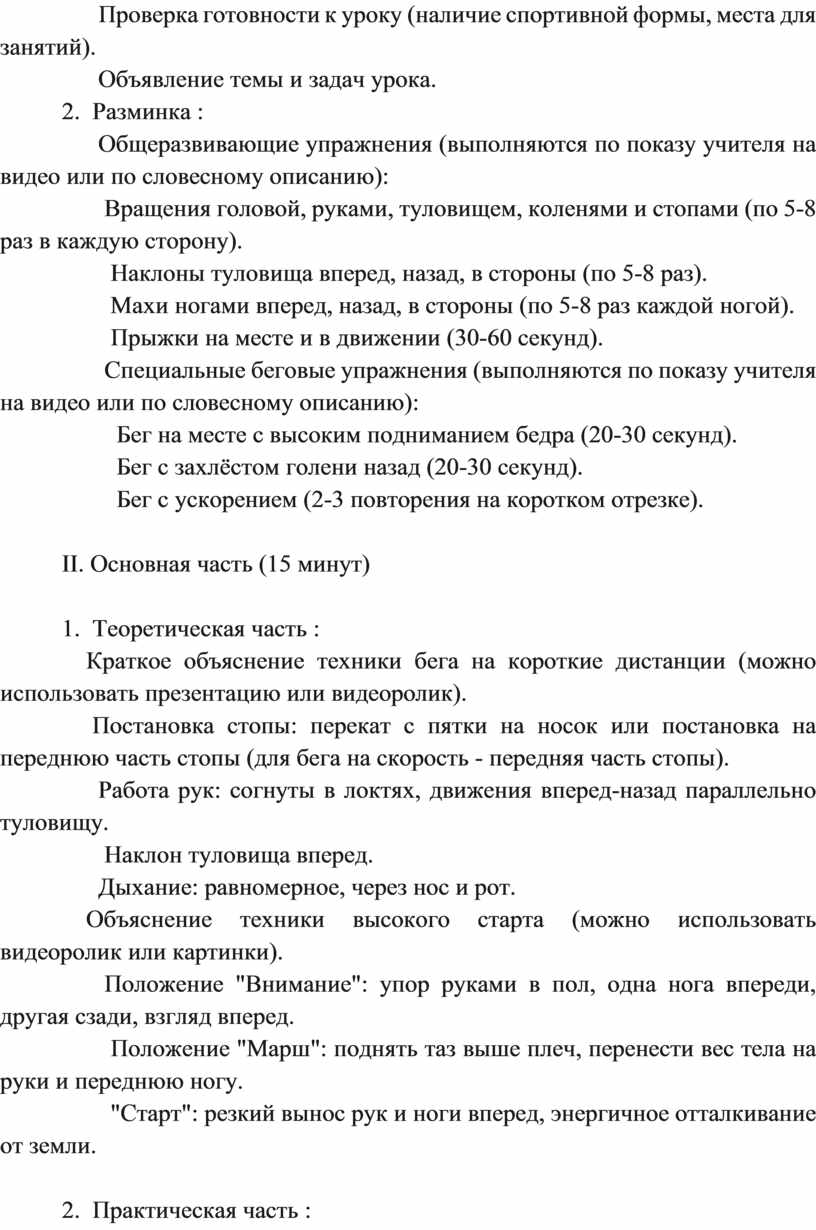 На следующем уроке уделить больше времени отработке высокого старта с использованием различных упражнений на развитие взрывной силы.