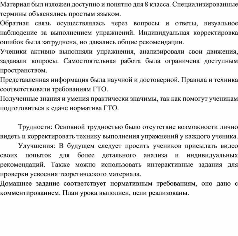 Трудности: Основной трудностью было отсутствие возможности лично видеть и корректировать технику выполнения упражнений у каждого ученика.