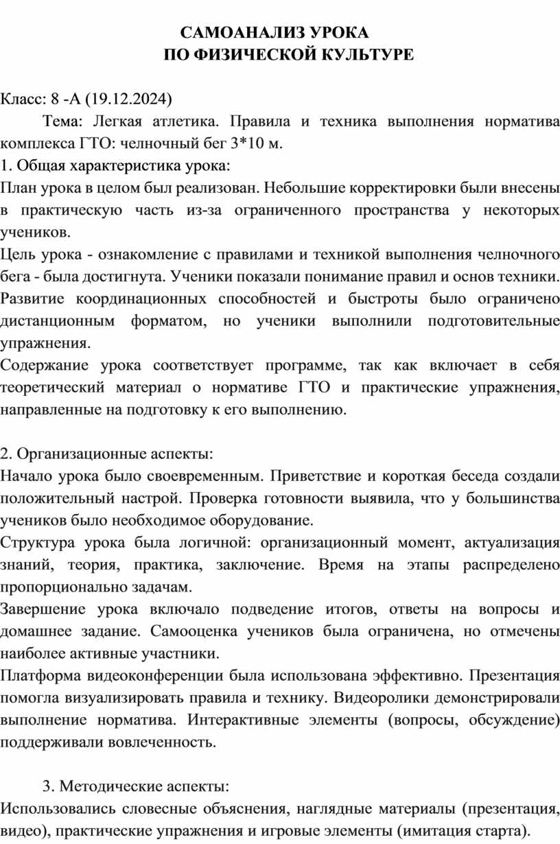 Цель урока - ознакомление с правилами и техникой выполнения челночного бега - была достигнута. Ученики показали понимание правил и основ техники. Развитие координационных способностей и быстроты было ограничено дистанционным форматом, но ученики выполнили подготовительные упражнения.