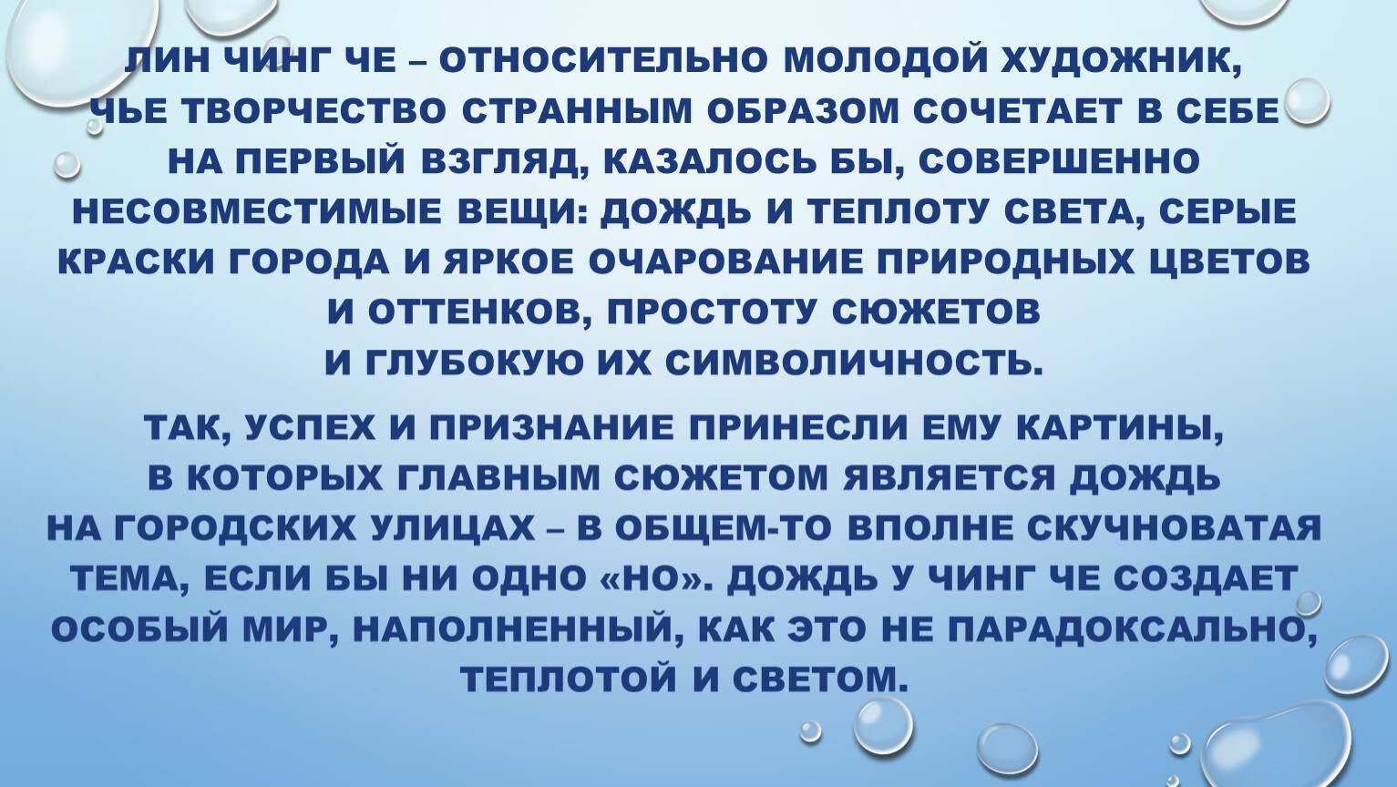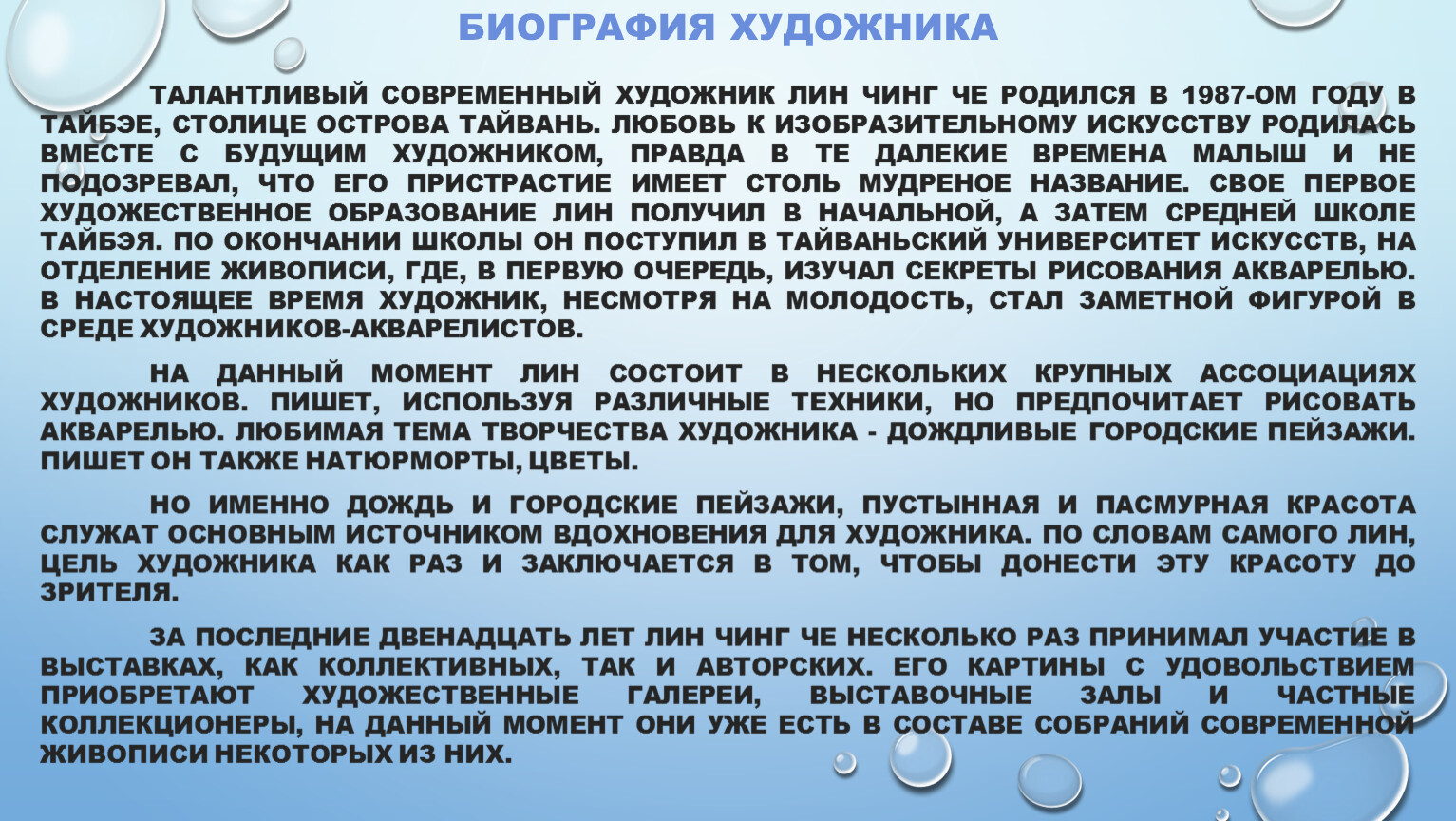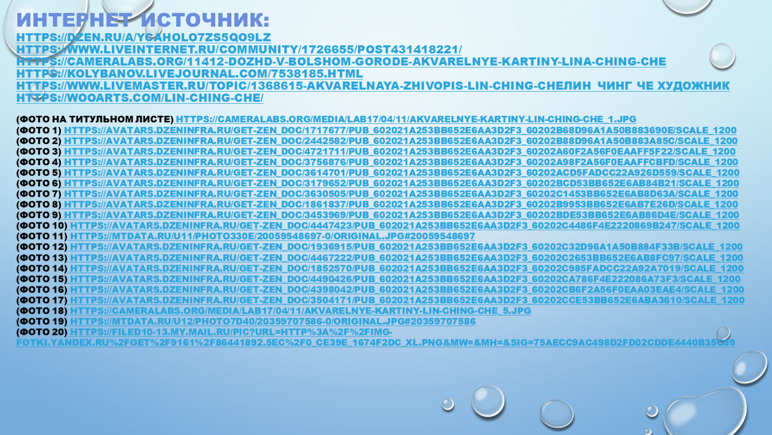 Интернет источник:https://dzen.ru/a/YCAholO7ZS5qo9Lzhttps://www.liveinternet.ru/community/1726655/post431418221/https://cameralabs.org/11412-dozhd-v-bolshom-gorode-akvarelnye-kartiny-lina-ching-chehttps://kolybanov.livejournal.com/7538185.htmlhttps://www.livemaster.ru/topic/1368615-akvarelnaya-zhivopis-lin-ching-cheлин чинг че художникhttps://wooarts.com/lin-ching-che/