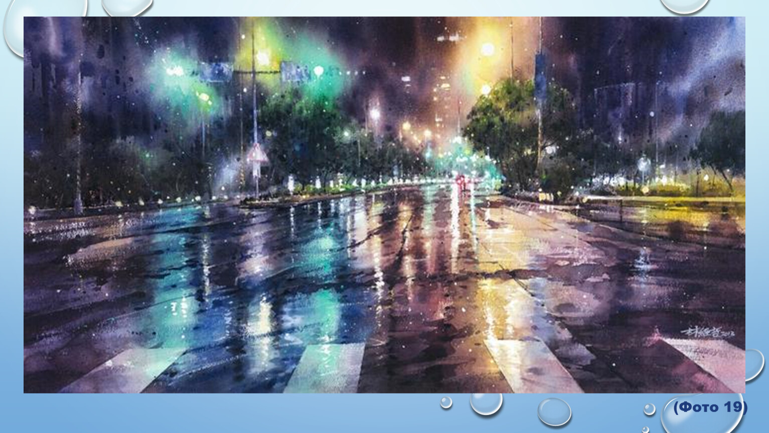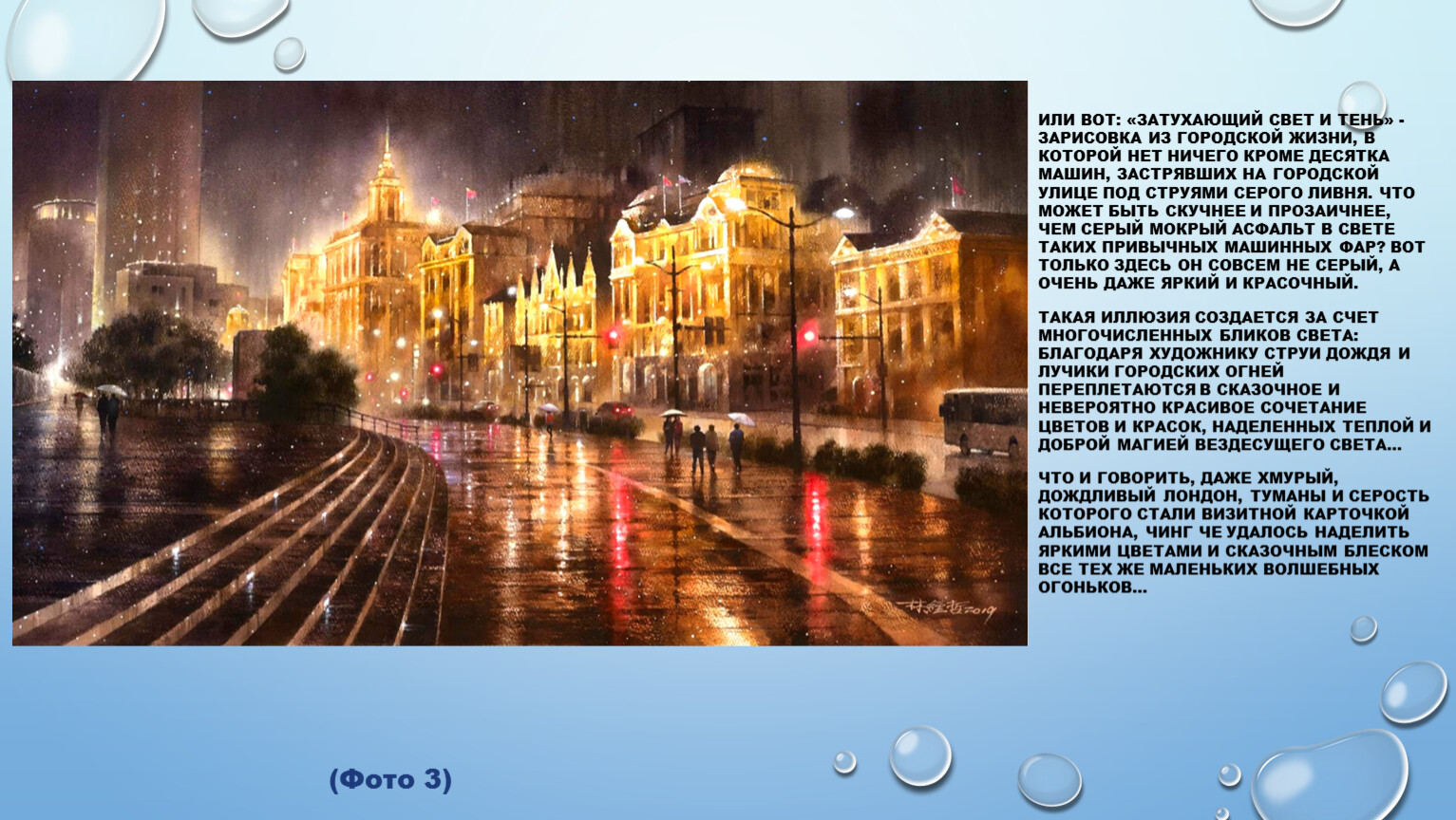 Такая иллюзия создается за счет многочисленных бликов света: благодаря художнику струи дождя и лучики городских огней переплетаются в сказочное и невероятно красивое сочетание цветов и красок, наделенных теплой и доброй магией вездесущего света…