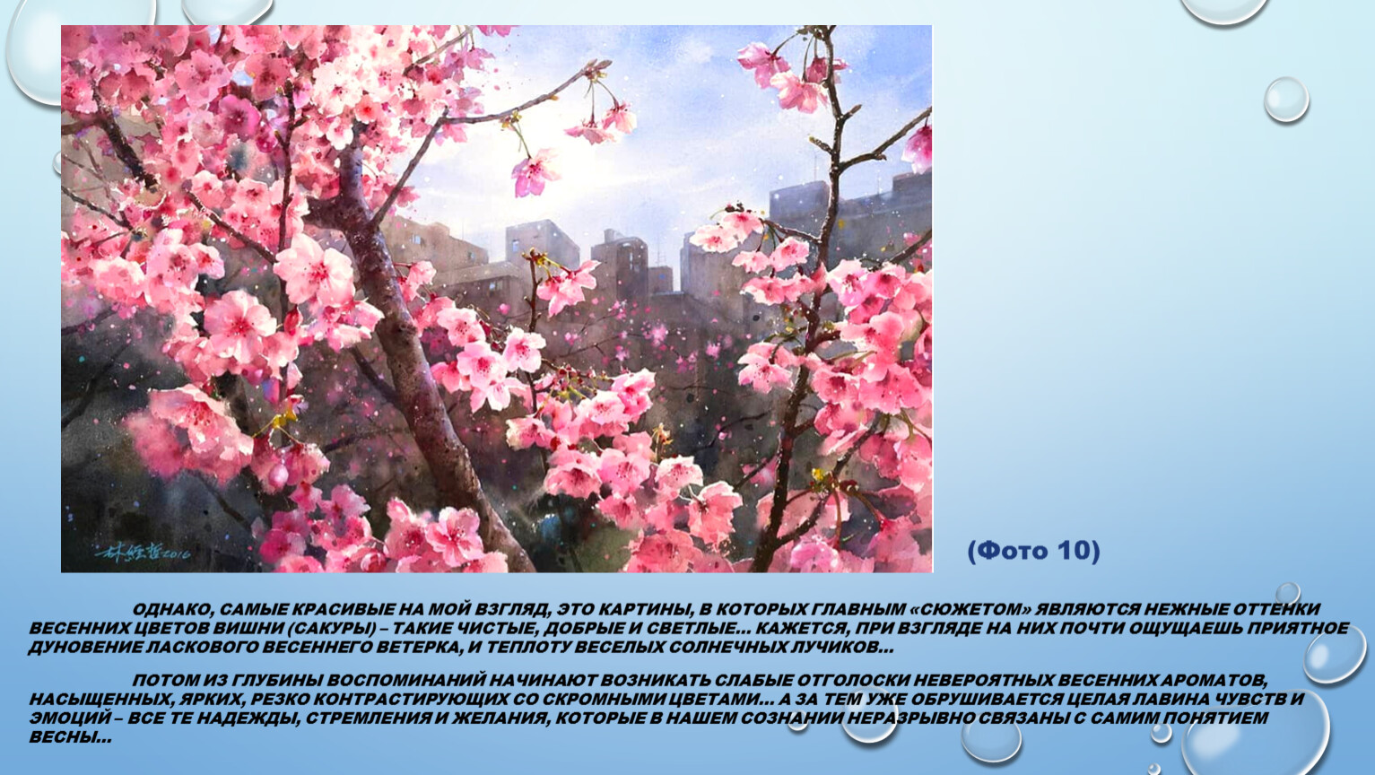 Однако, самые красивые на мой взгляд, это картины, в которых главным «сюжетом» являются нежные оттенки весенних цветов вишни (сакуры) – такие чистые, добрые и светлые… Кажется, при взгляде на них почти ощущаешь приятное дуновение ласкового весеннего ветерка, и теплоту веселых солнечных лучиков…