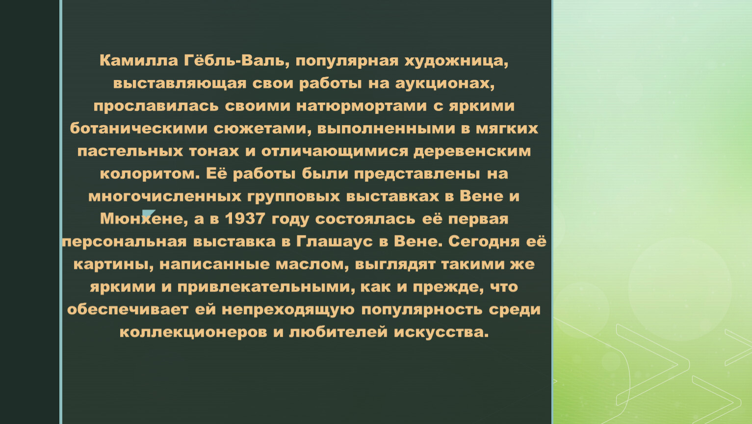 Камилла Гёбль-Валь, популярная художница, выставляющая свои работы на аукционах, прославилась своими натюрмортами с яркими ботаническими сюжетами, выполненными в мягких пастельных тонах и отличающимися деревенским колоритом. Её работы были представлены на многочисленных групповых выставках в Вене и Мюнхене, а в 1937 году состоялась её первая персональная выставка в Глашаус в Вене. Сегодня её картины, написанные маслом, выглядят такими же яркими и привлекательными, как и прежде, что обеспечивает ей непреходящую популярность среди коллекционеров и любителей искусства.