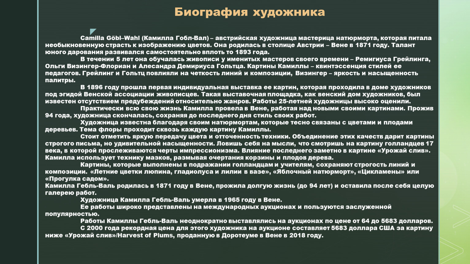 Camilla Göbl–Wahl (Камилла Гобл-Вал) – австрийская художница мастерица натюрморта, которая питала необыкновенную страсть к изображению цветов. Она родилась в столице Австрии – Вене в 1871 году. Талант юного дарования развивался самостоятельно вплоть то 1893 года.
