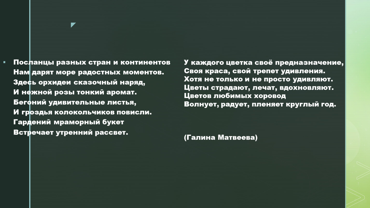 Посланцы разных стран и континентовНам дарят море радостных моментов.Здесь орхидеи сказочный наряд,И нежной розы тонкий аромат.Бегоний удивительные листья,И гроздья колокольчиков повисли.Гардений мраморный букетВстречает утренний рассвет.