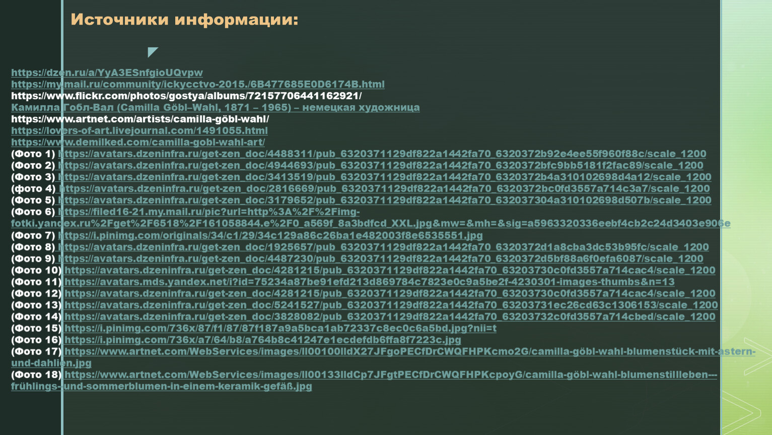 https://dzen.ru/a/YyA3ESnfgioUQvpwhttps://my.mail.ru/community/ickycctvo-2015./6B477685E0D6174B.htmlhttps://www.flickr.com/photos/gostya/albums/72157706441162921/Камилла Гобл-Вал (Camilla Göbl–Wahl, 1871 – 1965) – немецкая художницаhttps://www.artnet.com/artists/camilla-göbl-wahl/https://lovers-of-art.livejournal.com/1491055.html