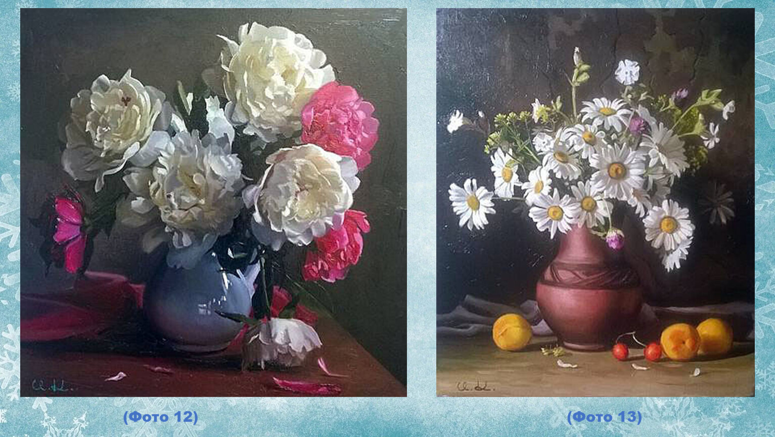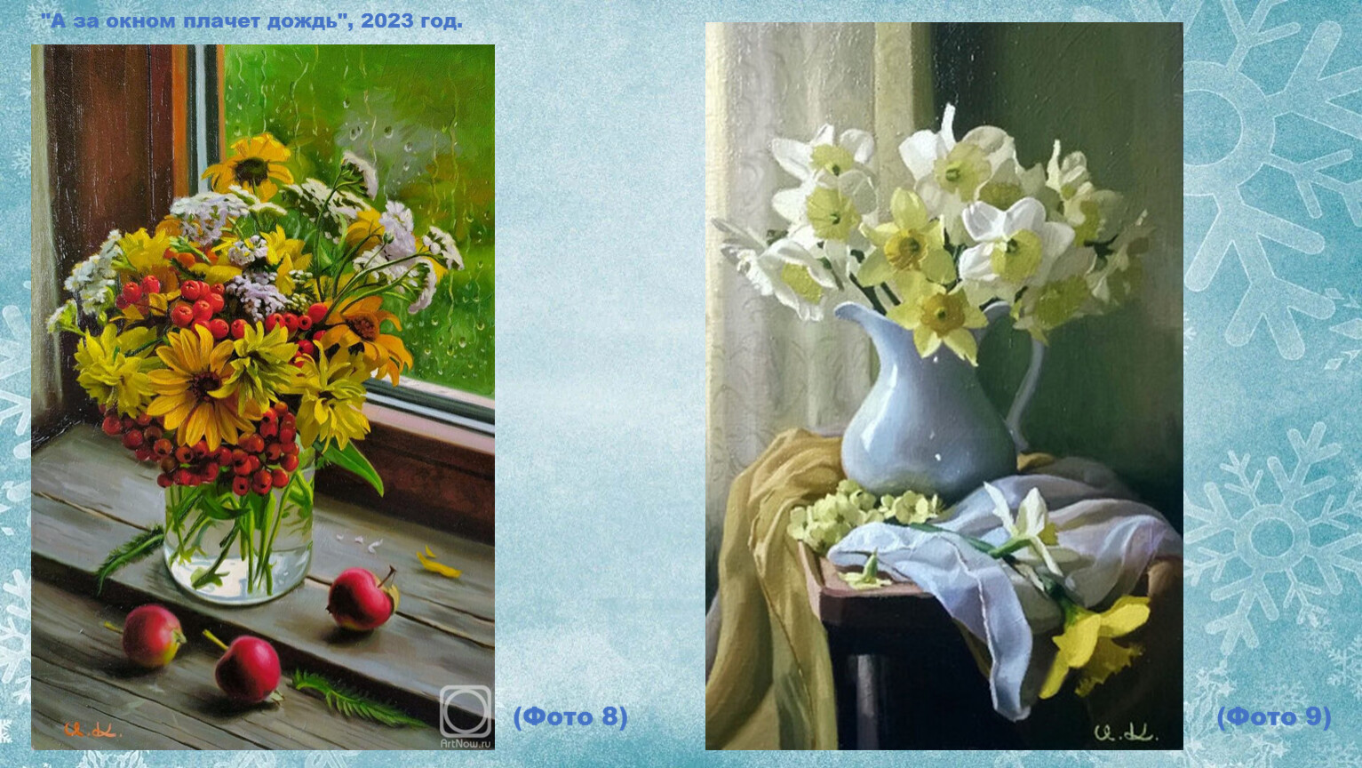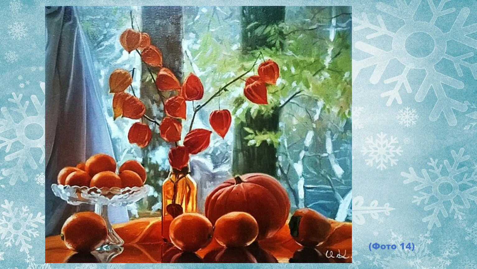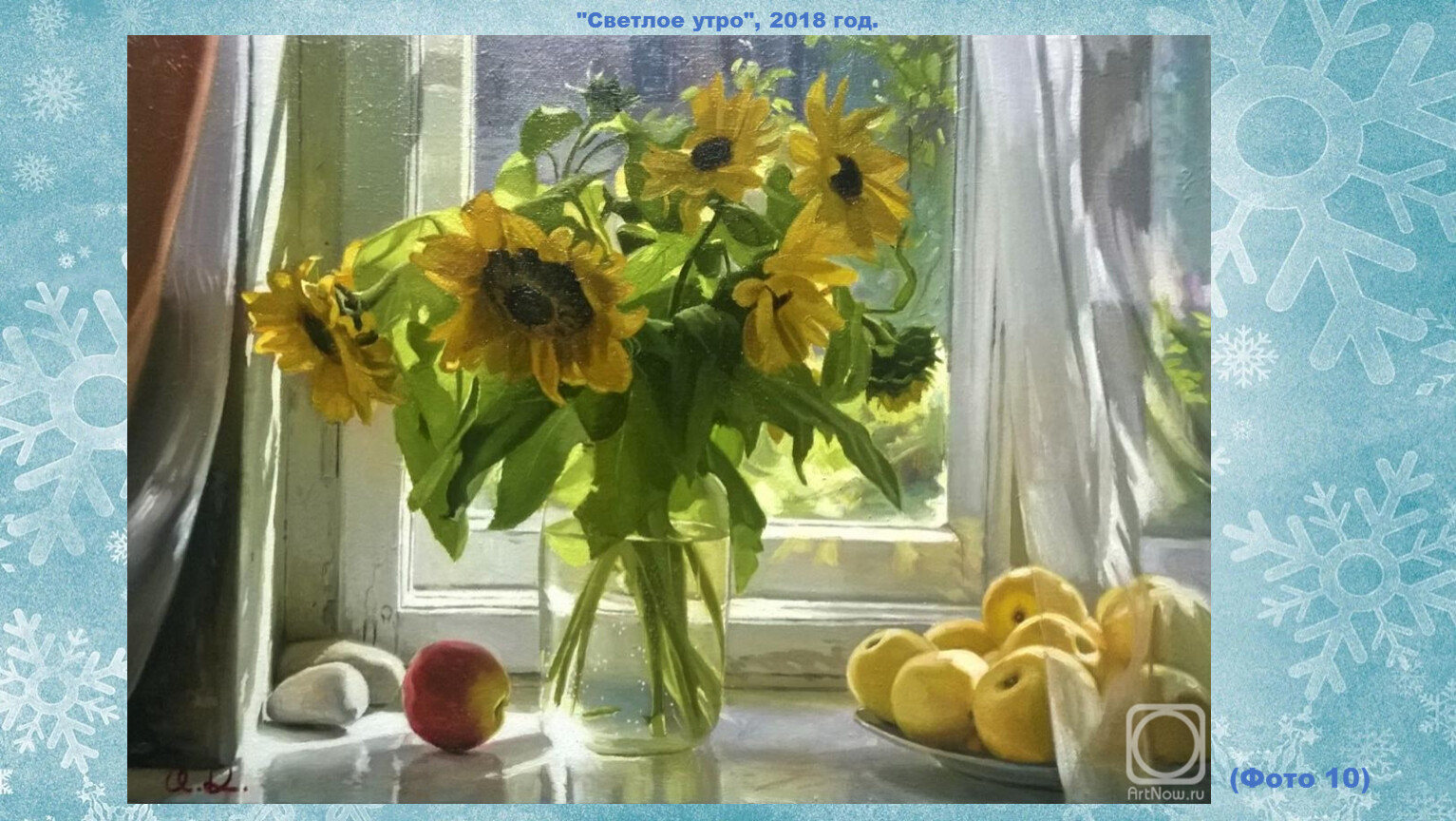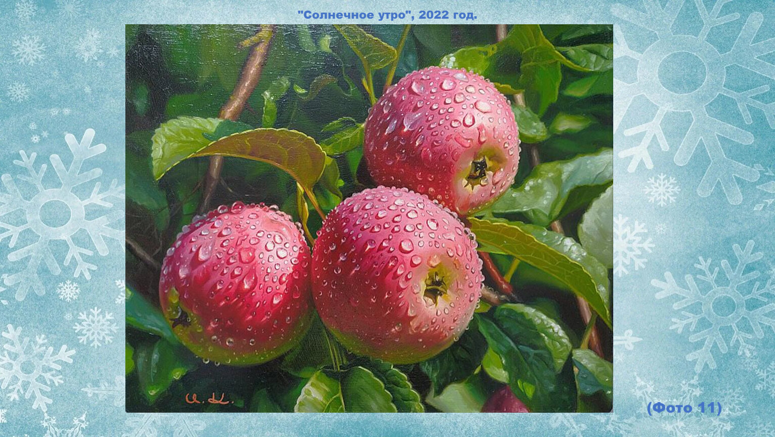 Этот художник работает не только как пейзажист. Впрочем, его картины при первом рассмотрении даже больше похожи на фотографии. Очень уж реалистично смотрятся солнечные блики на оконном стекле, капли росы на румяной яблочной кожице и напоённый свежестью зимний воздух.