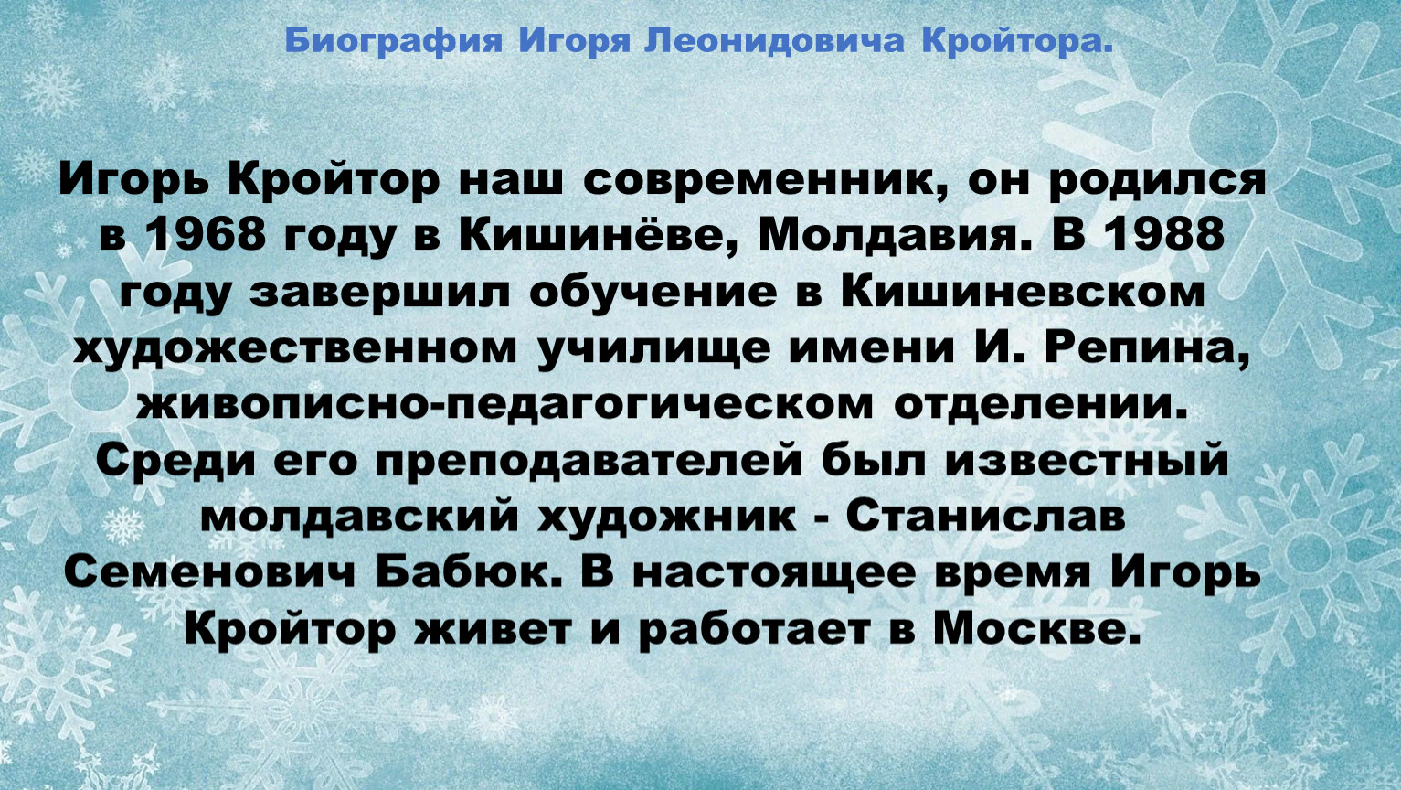 Игорь Кройтор наш современник, он родился в 1968 году в Кишинёве, Молдавия. В 1988 году завершил обучение в Кишиневском художественном училище имени И. Репина, живописно-педагогическом отделении. Среди его преподавателей был известный молдавский художник - Станислав Семенович Бабюк. В настоящее время Игорь Кройтор живет и работает в Москве.