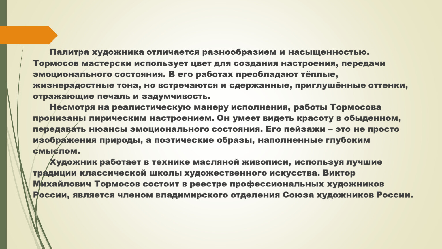 Несмотря на реалистическую манеру исполнения, работы Тормосова пронизаны лирическим настроением. Он умеет видеть красоту в обыденном, передавать нюансы эмоционального состояния. Его пейзажи – это не просто изображения природы, а поэтические образы, наполненные глубоким смыслом. Художник работает в технике масляной живописи, используя лучшие традиции классической школы художественного искусства. Виктор Михайлович Тормосов состоит в реестре профессиональных художников России, является членом владимирского отделения Союза художников России.