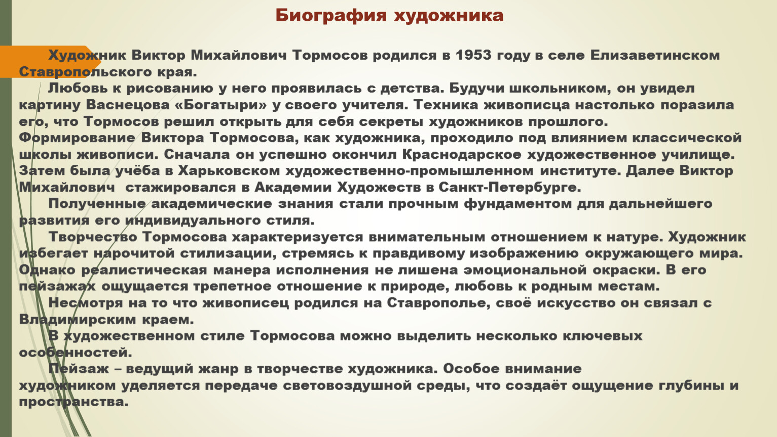 Методическая разработкапо изобразительному искусству на тему: «Виктор Михайлович Тормосов: живописный летописец родного края».