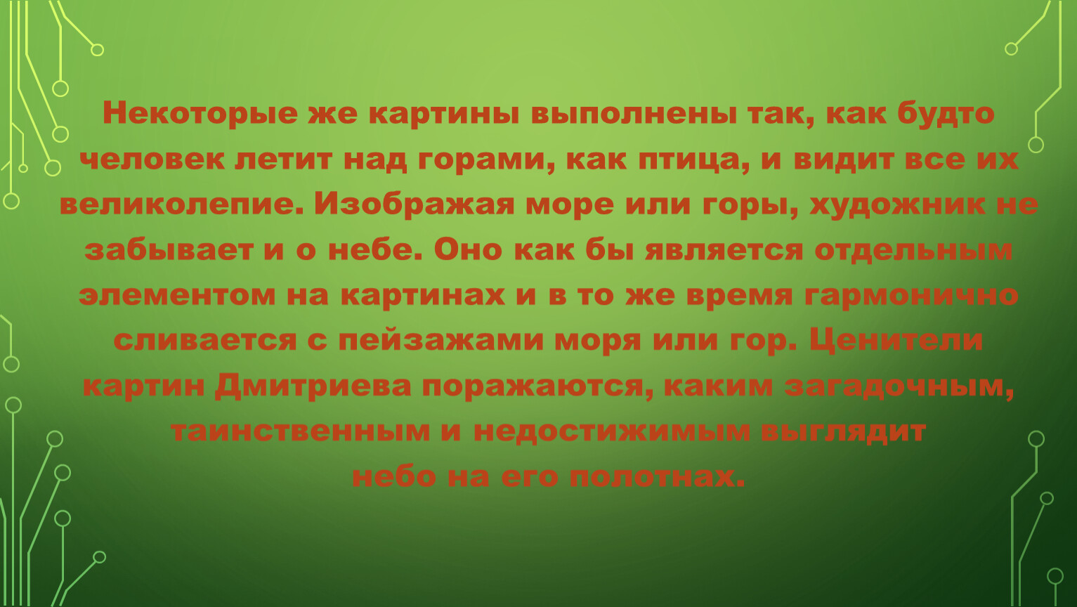 Некоторые же картины выполнены так, как будто человек летит над горами, как птица, и видит все их великолепие. Изображая море или горы, художник не забывает и о небе. Оно как бы является отдельным элементом на картинах и в то же время гармонично сливается с пейзажами моря или гор. Ценители картин Дмитриева поражаются, каким загадочным, таинственным и недостижимым выглядит небо на его полотнах.