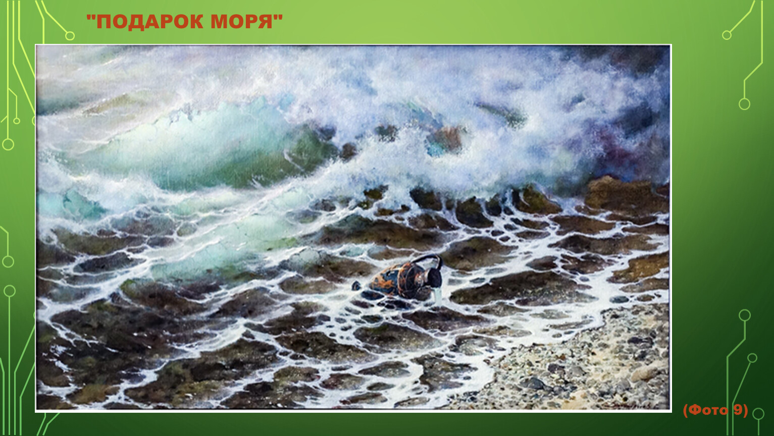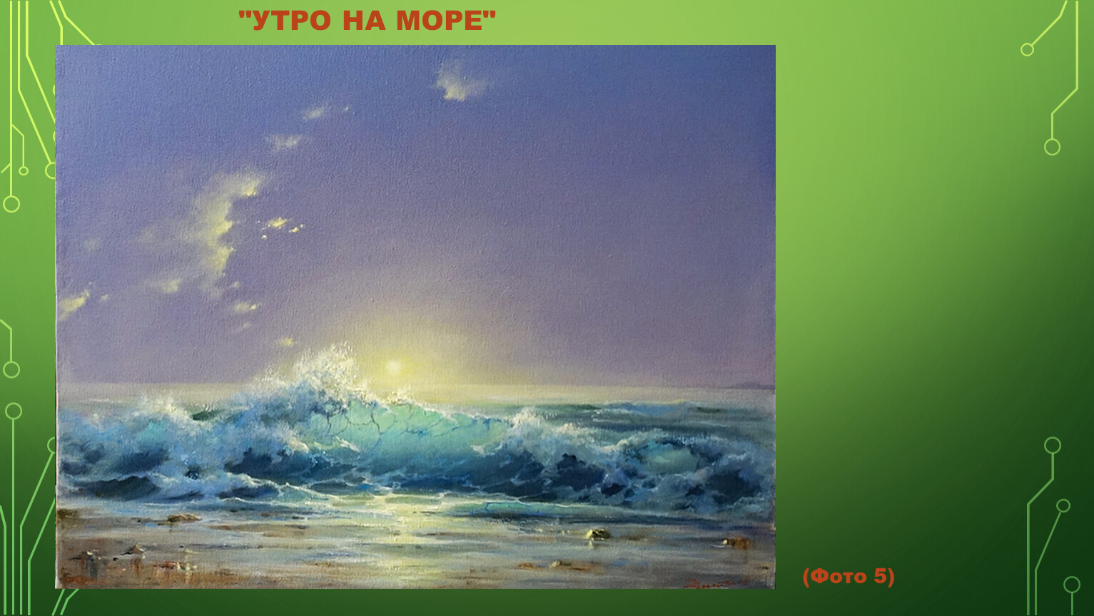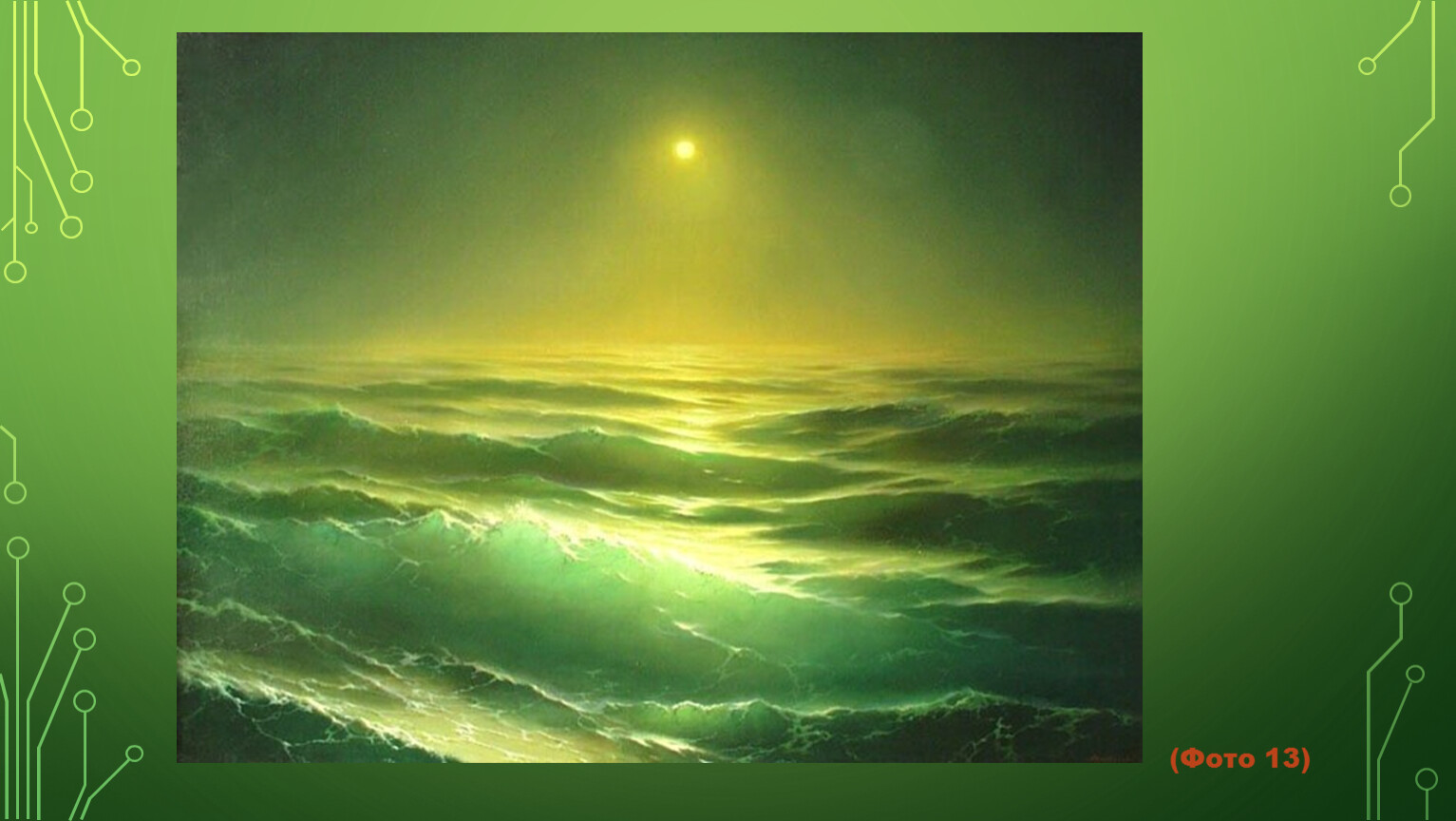В его изображениях морской стихии столько красок, что невозможно сразу оторваться от просмотра полотна – хочется рассматривать каждую деталь изображения. Хотя обычно считается, что море – это синева, на удивление, на картинах Дмитриева преобладают оттенки зеленого.
