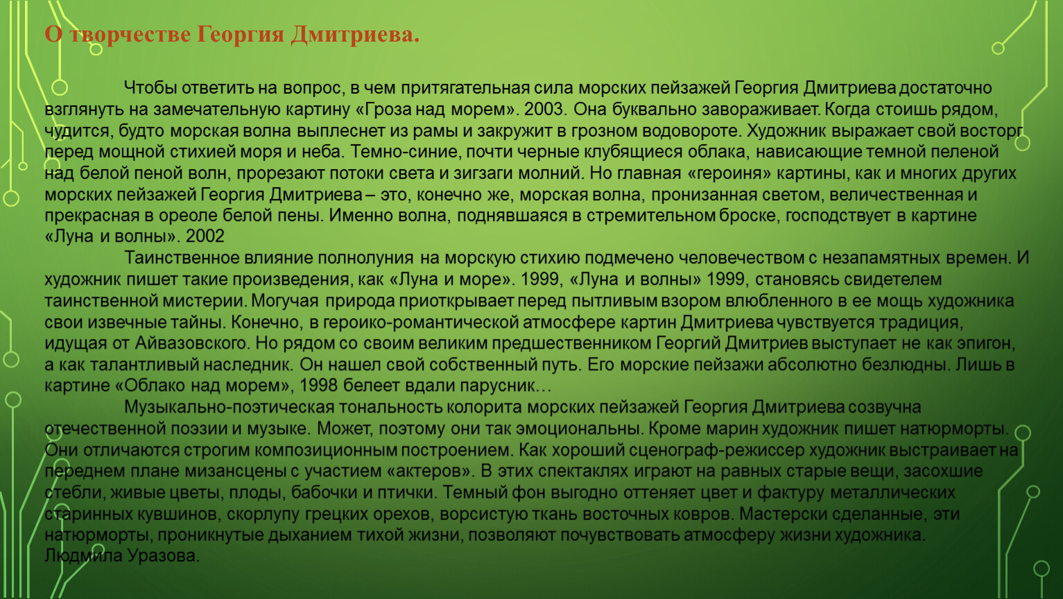 О творчестве Георгия Дмитриева. Чтобы ответить на вопрос, в чем притягательная сила морских пейзажей Георгия Дмитриева достаточно взглянуть на замечательную картину «Гроза над морем». 2003. Она буквально завораживает. Когда стоишь рядом, чудится, будто морская волна выплеснет из рамы и закружит в грозном водовороте. Художник выражает свой восторг перед мощной стихией моря и неба. Темно-синие, почти черные клубящиеся облака, нависающие темной пеленой над белой пеной волн, прорезают потоки света и зигзаги молний. Но главная «героиня» картины, как и многих других морских пейзажей Георгия Дмитриева – это, конечно же, морская волна, пронизанная светом, величественная и прекрасная в ореоле белой пены. Именно волна, поднявшаяся в стремительном броске, господствует в картине «Луна и волны». 2002 Таинственное влияние полнолуния на морскую стихию подмечено человечеством с незапамятных времен. И художник пишет такие произведения, как «Луна и море». 1999, «Луна и волны» 1999, становясь свидетелем таинственной мистерии. Могучая природа приоткрывает перед пытливым взором влюбленного в ее мощь художника свои извечные тайны. Конечно, в героико-романтической атмосфере картин Дмитриева чувствуется традиция, идущая от Айвазовского. Но рядом со своим великим предшественником Георгий Дмитриев выступает не как эпигон, а как талантливый наследник. Он нашел свой собственный путь. Его морские пейзажи абсолютно безлюдны. Лишь в картине «Облако над морем», 1998 белеет вдали парусник… Музыкально-поэтическая тональность колорита морских пейзажей Георгия Дмитриева созвучна отечественной поэзии и музыке. Может, поэтому они так эмоциональны. Кроме марин художник пишет натюрморты. Они отличаются строгим композиционным построением. Как хороший сценограф-режиссер художник выстраивает на переднем плане мизансцены с участием «актеров». В этих спектаклях играют на равных старые вещи, засохшие стебли, живые цветы, плоды, бабочки и птички. Темный фон выгодно оттеняет цвет и фактуру металлических старинных кувшинов, скорлупу грецких орехов, ворсистую ткань восточных ковров. Мастерски сделанные, эти натюрморты, проникнутые дыханием тихой жизни, позволяют почувствовать атмосферу жизни художника.Людмила Уразова.