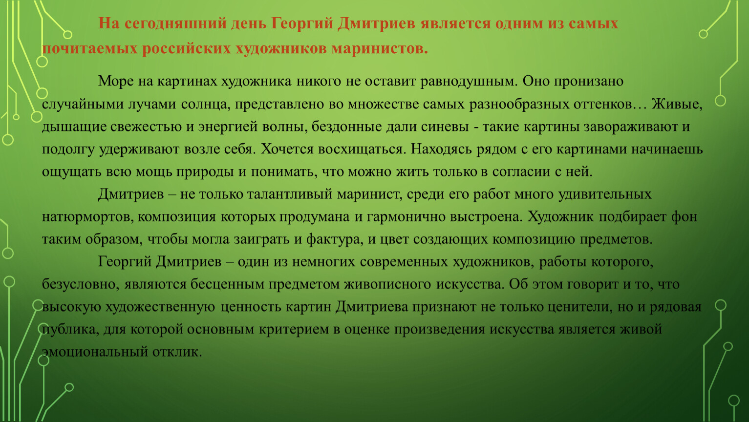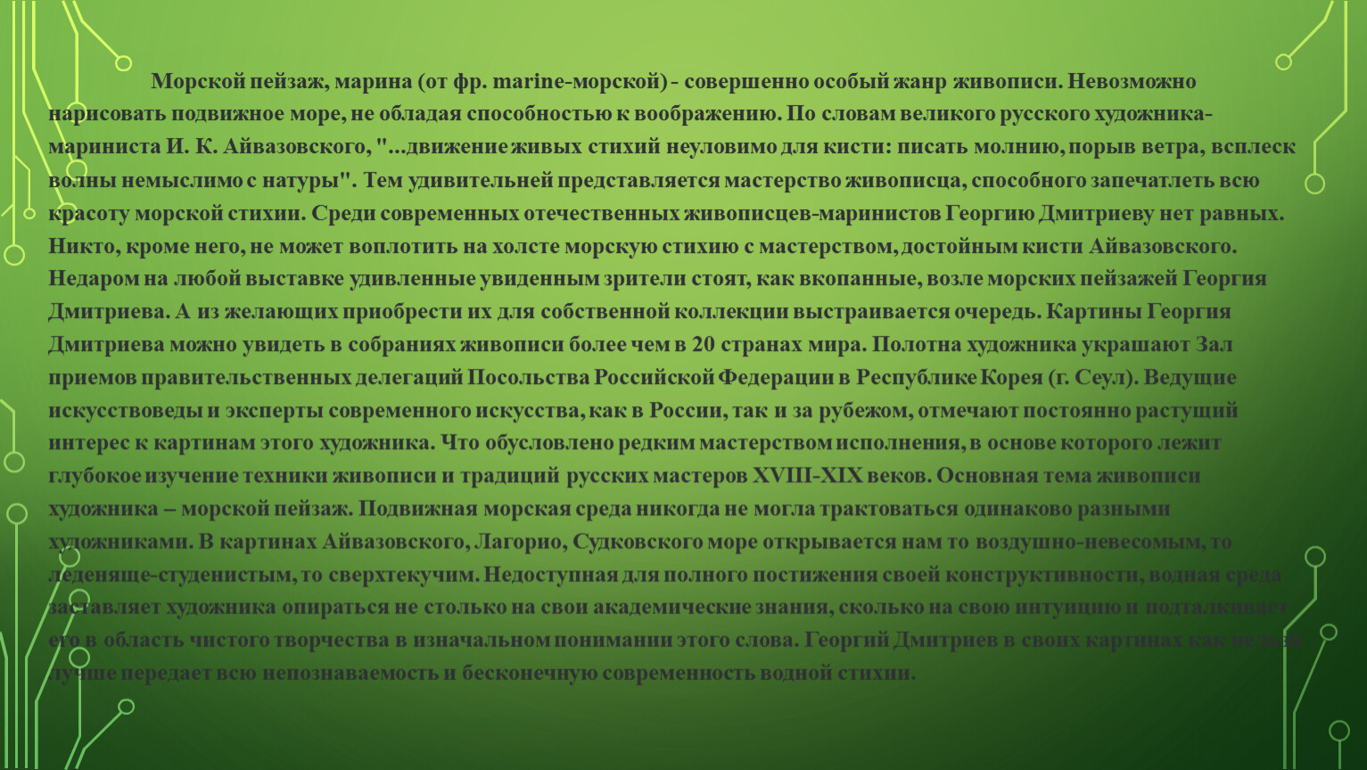 Морской пейзаж, марина (от фр. marine-морской) - совершенно особый жанр живописи. Невозможно нарисовать подвижное море, не обладая способностью к воображению. По словам великого русского художника-мариниста И. К. Айвазовского, "...движение живых стихий неуловимо для кисти: писать молнию, порыв ветра, всплеск волны немыслимо с натуры". Тем удивительней представляется мастерство живописца, способного запечатлеть всю красоту морской стихии. Среди современных отечественных живописцев-маринистов Георгию Дмитриеву нет равных. Никто, кроме него, не может воплотить на холсте морскую стихию с мастерством, достойным кисти Айвазовского. Недаром на любой выставке удивленные увиденным зрители стоят, как вкопанные, возле морских пейзажей Георгия Дмитриева. А из желающих приобрести их для собственной коллекции выстраивается очередь. Картины Георгия Дмитриева можно увидеть в собраниях живописи более чем в 20 странах мира. Полотна художника украшают Зал приемов правительственных делегаций Посольства Российской Федерации в Республике Корея (г. Сеул). Ведущие искусствоведы и эксперты современного искусства, как в России, так и за рубежом, отмечают постоянно растущий интерес к картинам этого художника. Что обусловлено редким мастерством исполнения, в основе которого лежит глубокое изучение техники живописи и традиций русских мастеров ХVIII-ХIХ веков. Основная тема живописи художника – морской пейзаж. Подвижная морская среда никогда не могла трактоваться одинаково разными художниками. В картинах Айвазовского, Лагорио, Судковского море открывается нам то воздушно-невесомым, то леденяще-студенистым, то сверхтекучим. Недоступная для полного постижения своей конструктивности, водная среда заставляет художника опираться не столько на свои академические знания, сколько на свою интуицию и подталкивает его в область чистого творчества в изначальном понимании этого слова. Георгий Дмитриев в своих картинах как нельзя лучше передает всю непознаваемость и бесконечную современность водной стихии.