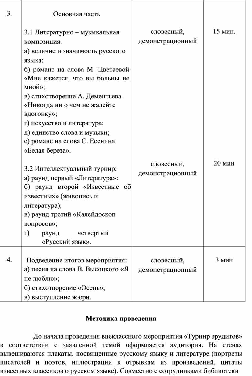 Мероприятие состоит из двух этапов: литературно-музыкальная композиция и интеллектуальный турнир. Использование в рамках одного мероприятия двух форм проведения позволяет разнообразить материал, привлечь внимание студентов к изучению русского языка и литературы, продемонстрировать их знания.