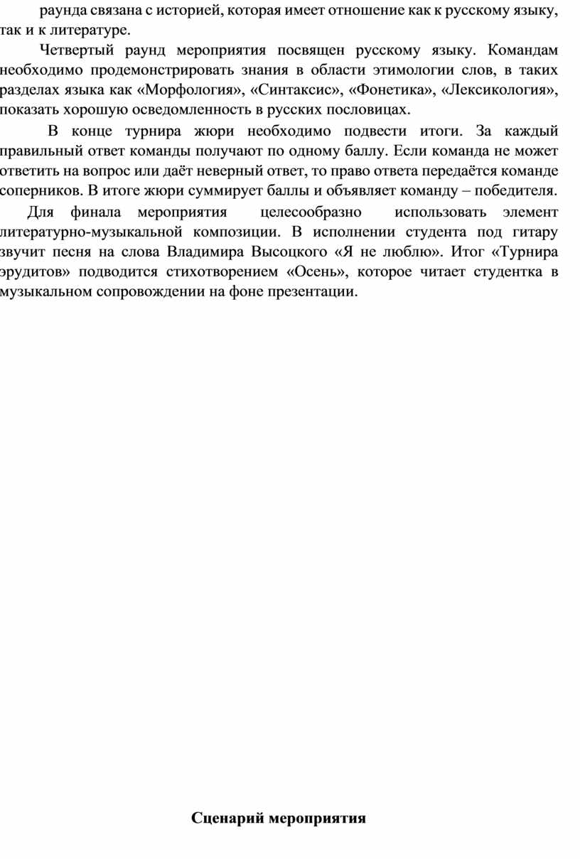 Для финала мероприятия целесообразно использовать элемент литературно-музыкальной композиции. В исполнении студента под гитару звучит песня на слова Владимира Высоцкого «Я не люблю». Итог «Турнира эрудитов» подводится стихотворением «Осень», которое читает студентка в музыкальном сопровождении на фоне презентации.