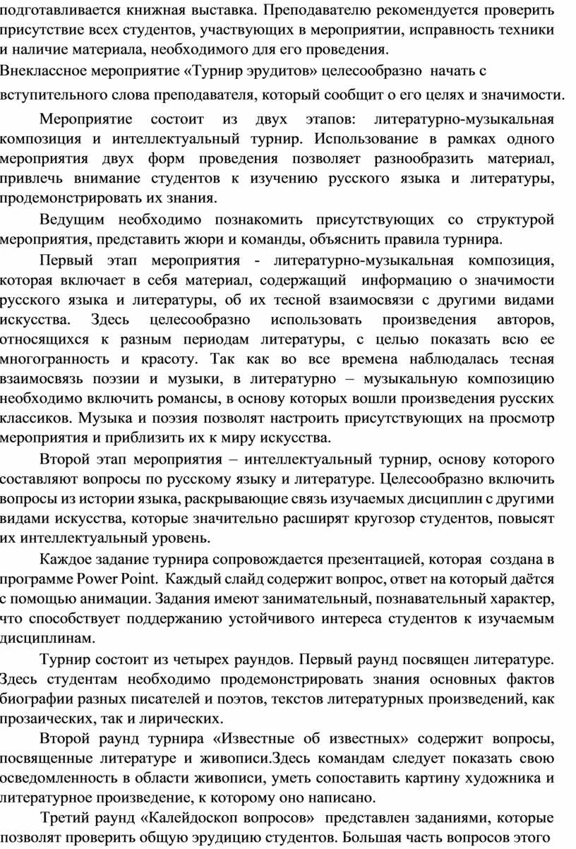 Данная методическая разработка содержит материал, который предназначен для организации внеклассного мероприятия «Турнир эрудитов» среди студентов первого курса, изучающих общеобразовательные дисциплины. Работа способствует повторению материала по русскому языку и литературеи позволяет проверить степень его усвоения.