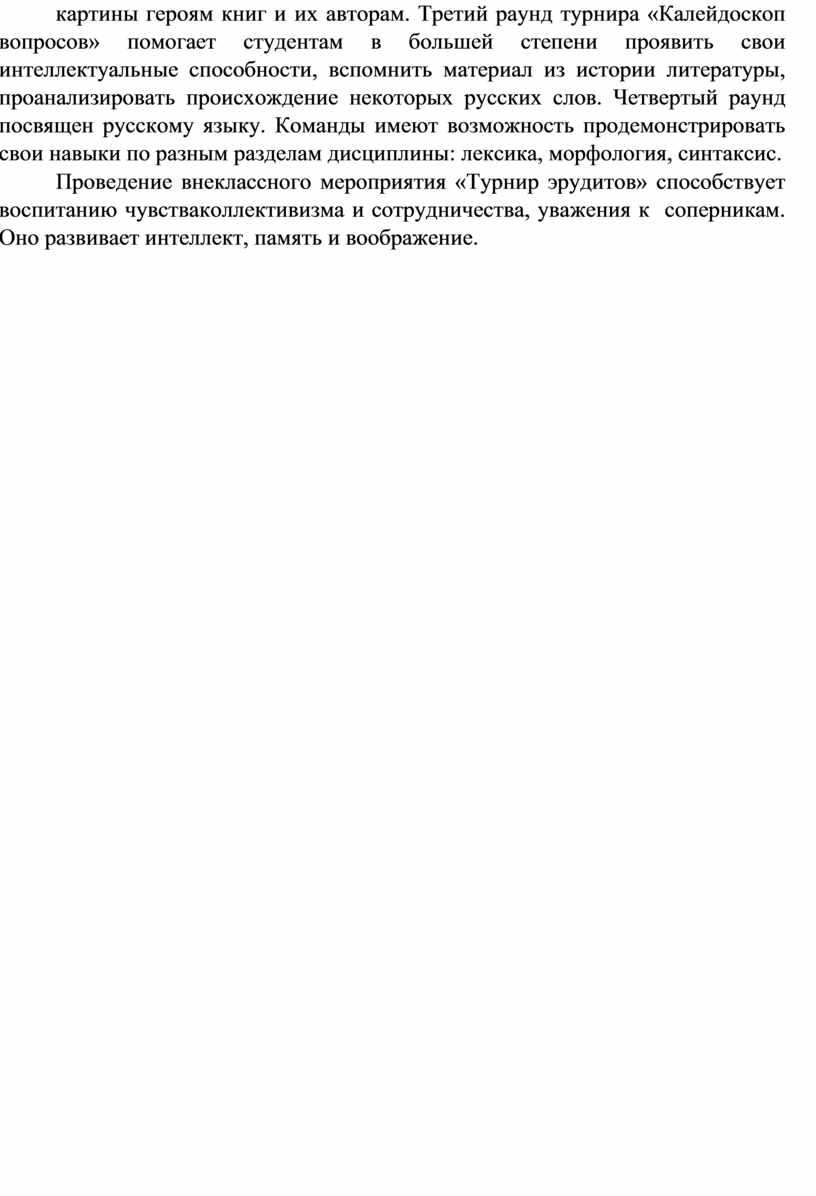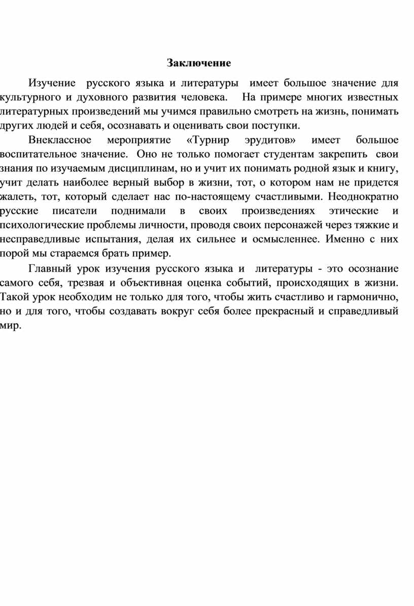 Внеклассное мероприятие «Турнир эрудитов» имеет большое воспитательное значение. Оно не только помогает студентам закрепить свои знания по изучаемым дисциплинам, но и учит их понимать родной язык и книгу, учит делать наиболее верный выбор в жизни, тот, о котором нам не придется жалеть, тот, который сделает нас по-настоящему счастливыми. Неоднократно русские писатели поднимали в своих произведениях этические и психологические проблемы личности, проводя своих персонажей через тяжкие и несправедливые испытания, делая их сильнее и осмысленнее. Именно с них порой мы стараемся брать пример.