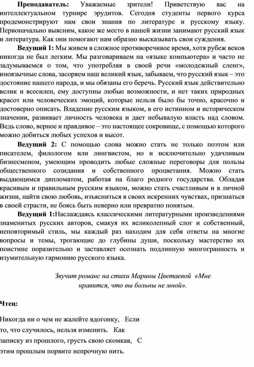 Преподаватель: Уважаемые зрители! Приветствую вас на интеллектуальном турнире эрудитов. Сегодня студенты первого курса продемонстрируют нам свои знания по литературе и русскому языку. Первоначально выясним, какое же место в нашей жизни занимают русский язык и литература. Как они помогают нам образно высказывать свои суждения.