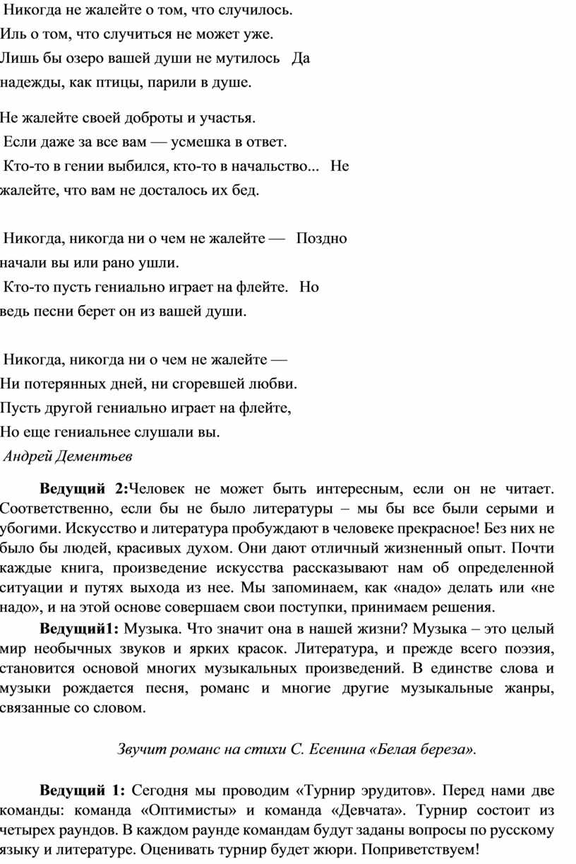 3.1 Литературно – музыкальная композиция: а) величие и значимость русского языка; б) романс на слова М. Цветаевой «Мне кажется, что вы больны не мной»; в) стихотворение А. Дементьева «Никогда ни о чем не жалейте вдогонку»; г) искусство и литература; д) единство слова и музыки; е) романс на слова С. Есенина «Белая береза».