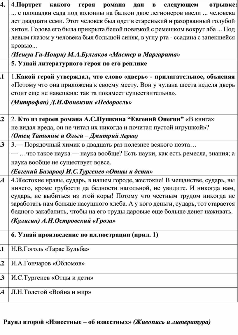 Второй раунд турнира «Известные об известных» содержит вопросы, посвященные литературе и живописи.Здесь командам следует показать свою осведомленность в области живописи, уметь сопоставить картину художника и литературное произведение, к которому оно написано.