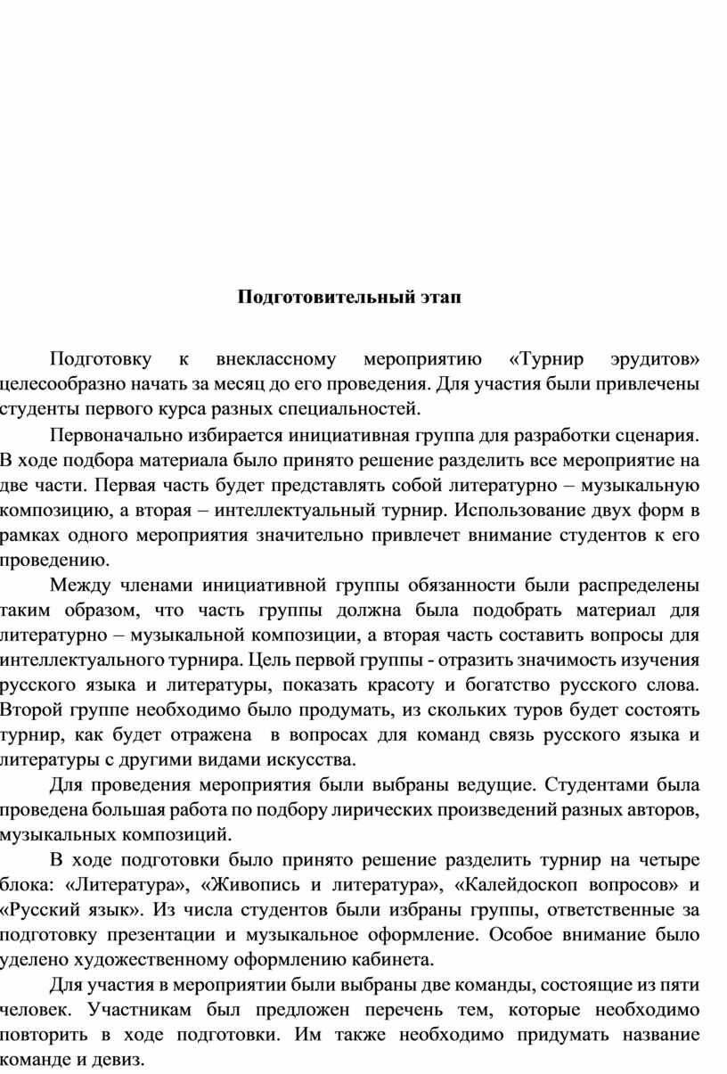 До начала проведения внеклассного мероприятия «Турнир эрудитов» в соответствии с заявленной темой оформляется аудитория. На стенах вывешиваются плакаты, посвященные русскому языку и литературе (портреты писателей и поэтов, иллюстрации к отрывкам из произведений, цитаты известных классиков о русском языке). Совместно с сотрудниками библиотеки подготавливается книжная выставка. Преподавателю рекомендуется проверить присутствие всех студентов, участвующих в мероприятии, исправность техники и наличие материала, необходимого для его проведения.