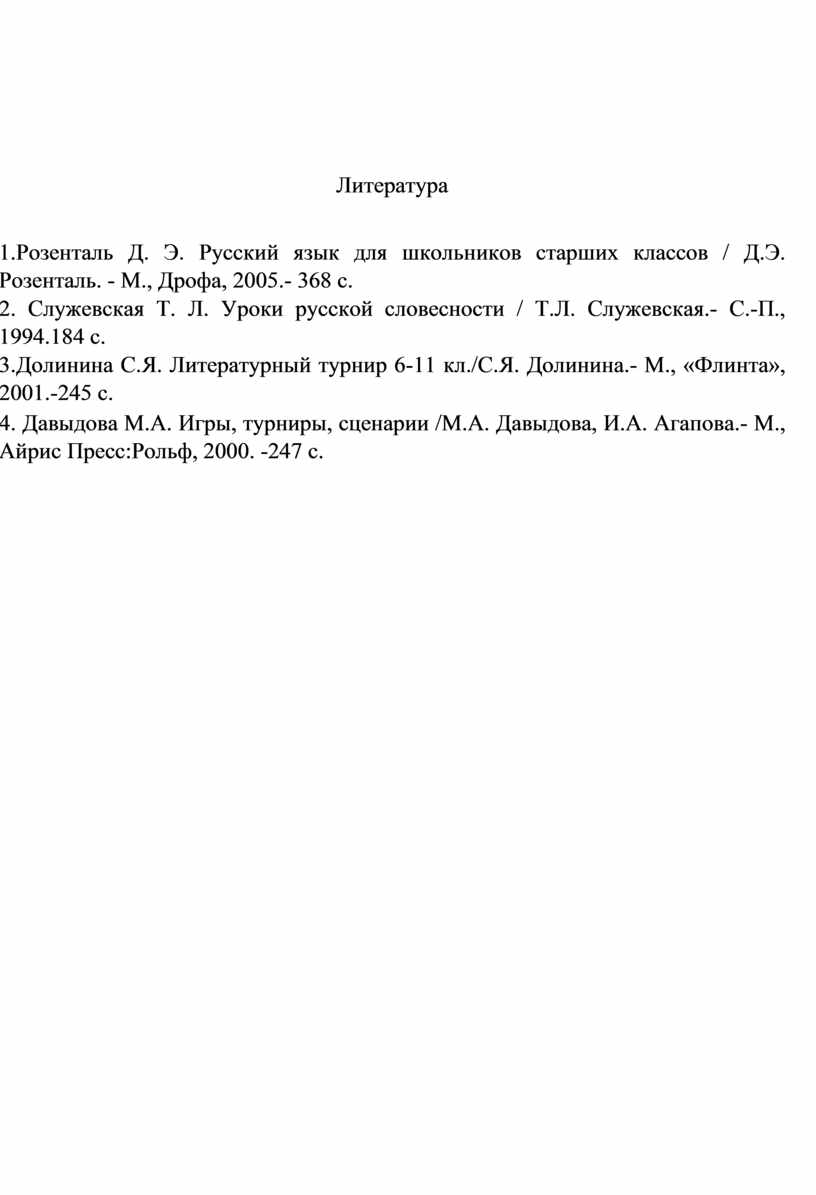 3.Долинина С.Я. Литературный турнир 6-11 кл./С.Я. Долинина.- М., «Флинта», 2001.-245 с.
