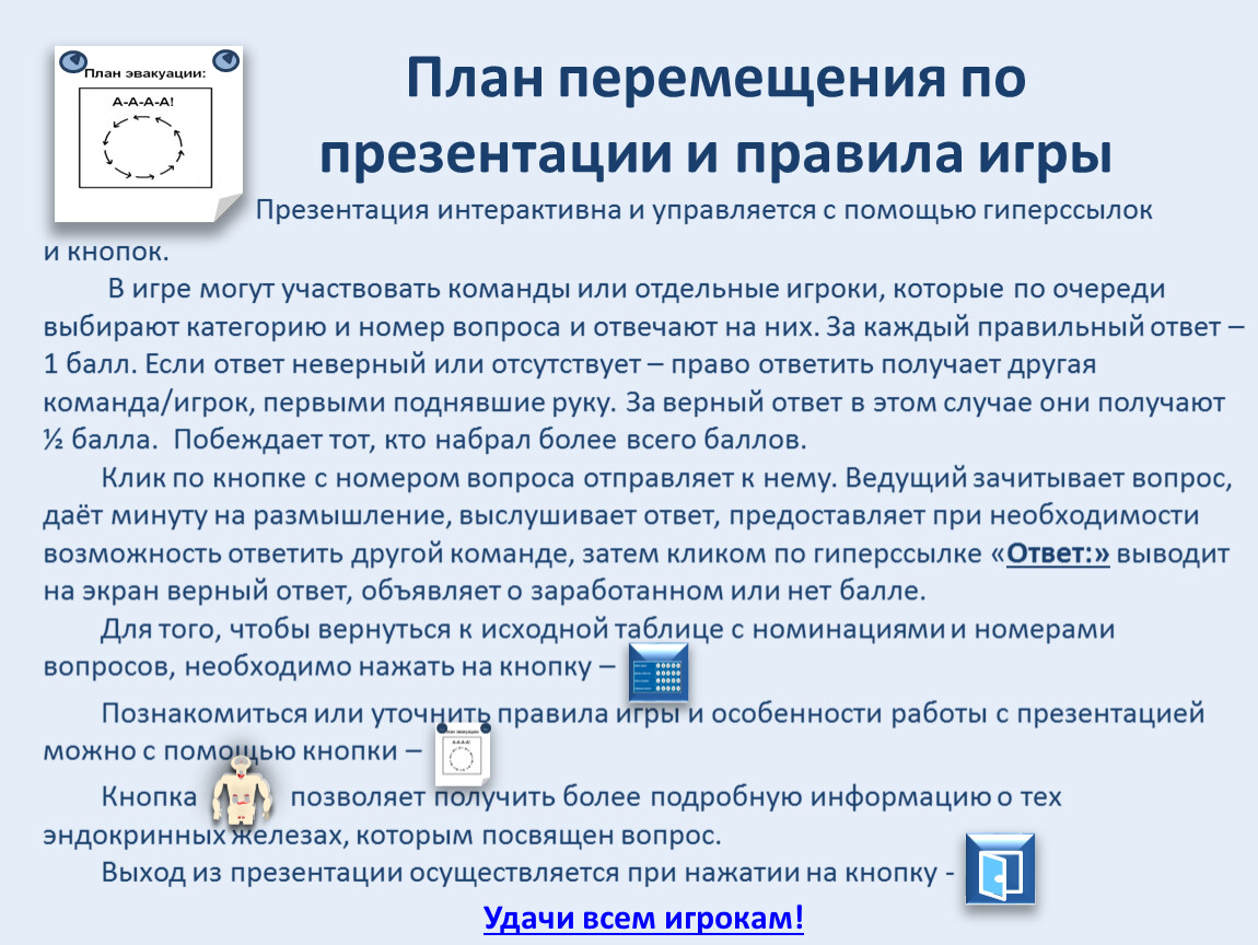 Познакомиться или уточнить правила игры и особенности работы с презентацией можно с помощью кнопки –