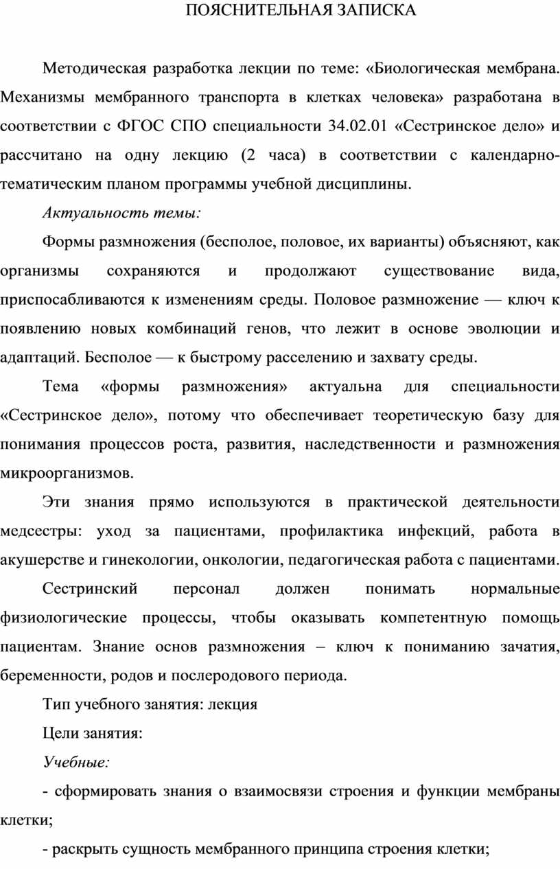 Методическая разработка лекции по теме: «Биологическая мембрана. Механизмы мембранного транспорта в клетках человека» разработана в соответствии с ФГОС СПО специальности 34.02.01 «Сестринское дело» и рассчитано на одну лекцию (2 часа) в соответствии с календарно-тематическим планом программы учебной дисциплины.