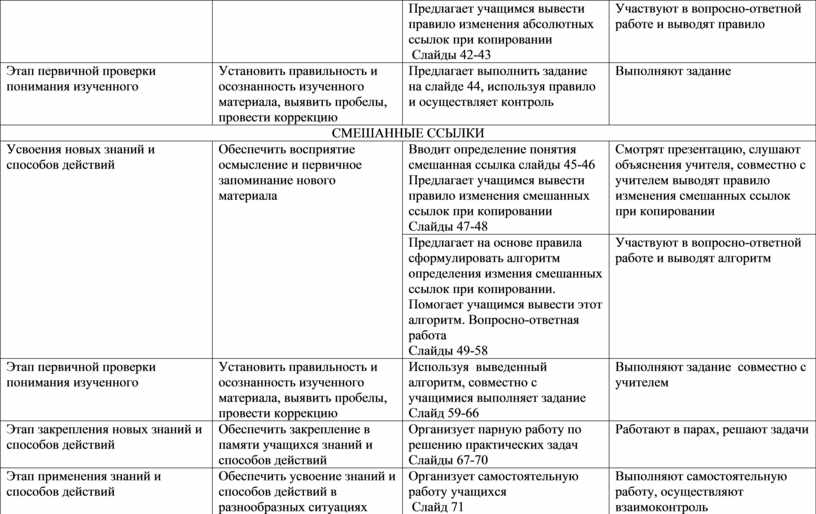 Вводит определение понятия смешанная ссылка слайды 45-46 Предлагает учащимся вывести правило изменения смешанных ссылок при копировании Слайды 47-48 |
