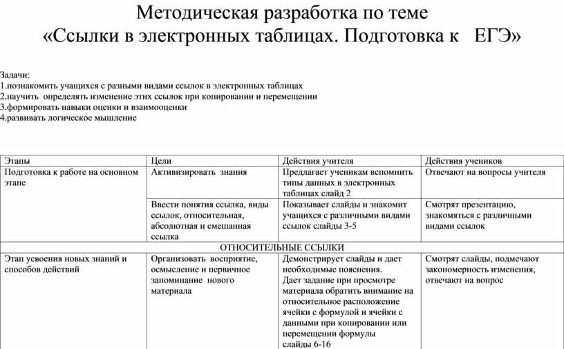 «Ссылки в электронных таблицах. Подготовка к ЕГЭ»