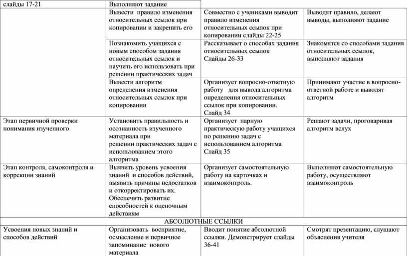 Совместно с учениками выводит правило изменения относительных ссылок при копировании слайды 22-25 |