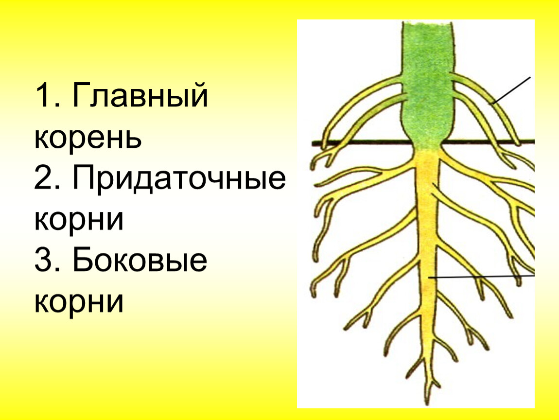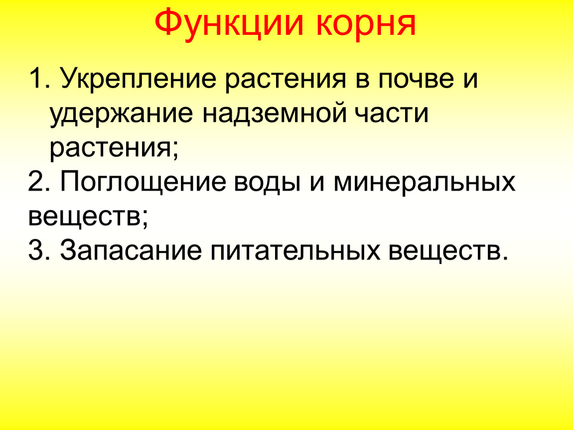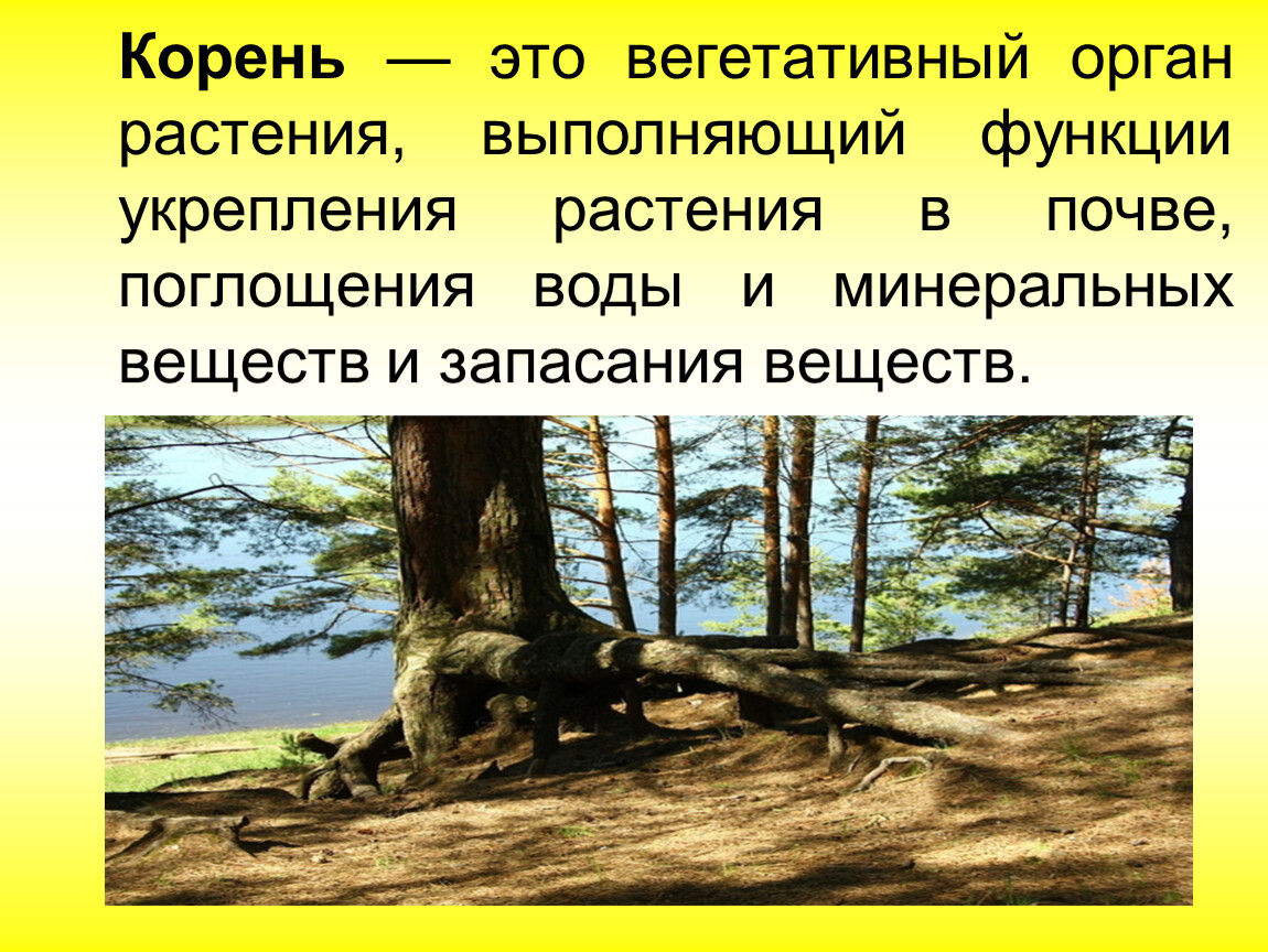 Корень — это вегетативный орган растения, выполняющий функции укрепления растения в почве, поглощения воды и минеральных веществ и запасания веществ.