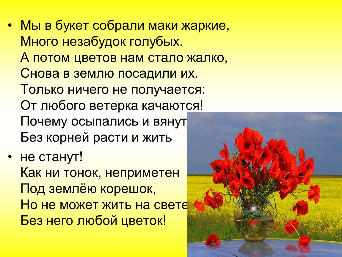 Мы в букет собрали маки жаркие,Много незабудок голубых.А потом цветов нам стало жалко,Снова в землю посадили их.Только ничего не получается:От любого ветерка качаются!Почему осыпались и вянут?Без корней расти и жить