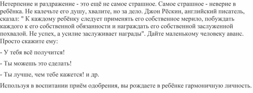 Нетерпение и раздражение - это ещё не самое страшное. Самое страшное - неверие в ребёнка. Не калечьте его душу, хвалите, но за дело. Джон Рёскин, английский писатель, сказал: " К каждому ребёнку следует применять его собственное мерило, побуждать каждого к его собственной обязанности и награждать его собственной заслуженной похвалой. Не успех, а усилие заслуживает награды". Дайте маленькому человеку аванс. Просто скажите ему: