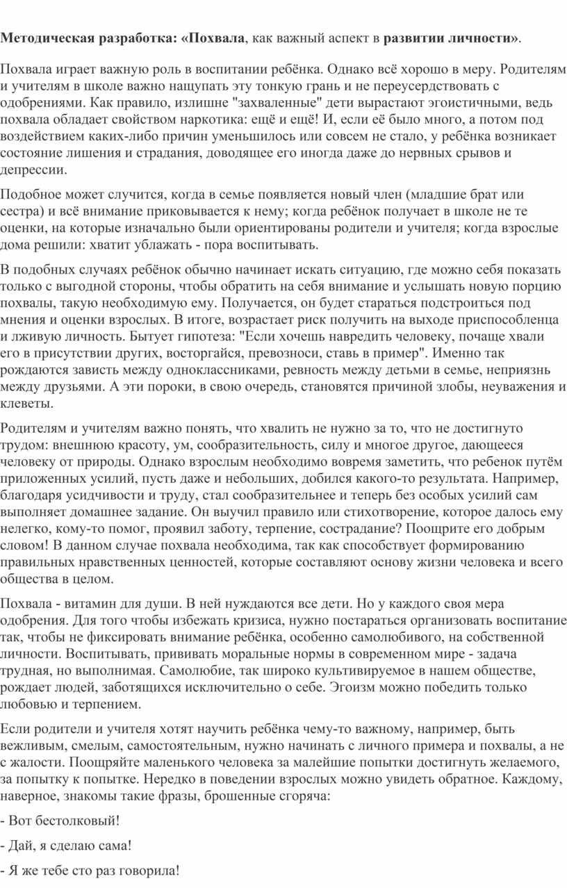 Методическая разработка: «Похвала, как важный аспект в развитии личности».