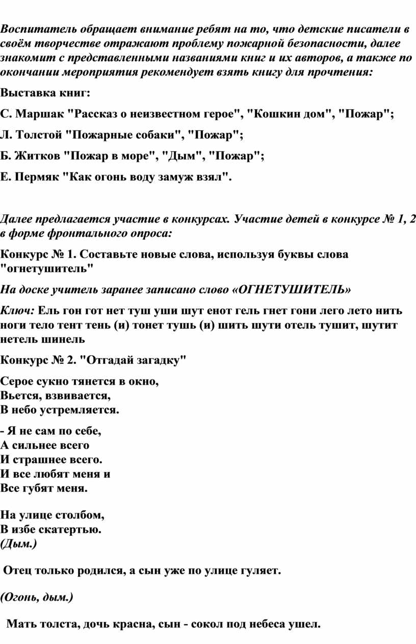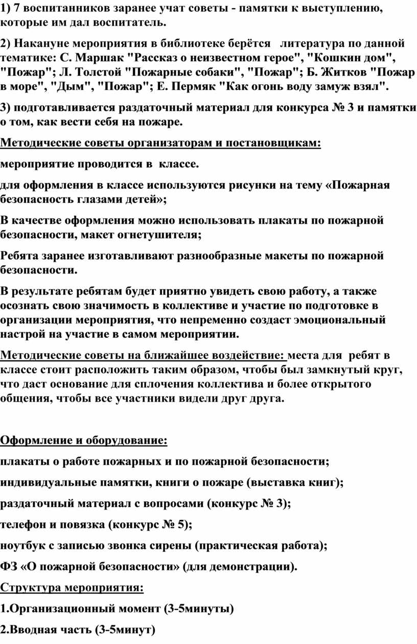2) Накануне мероприятия в библиотеке берётся литература по данной тематике: С. Маршак "Рассказ о неизвестном герое", "Кошкин дом", "Пожар"; Л. Толстой "Пожарные собаки", "Пожар"; Б. Житков "Пожар в море", "Дым", "Пожар"; Е. Пермяк "Как огонь воду замуж взял".